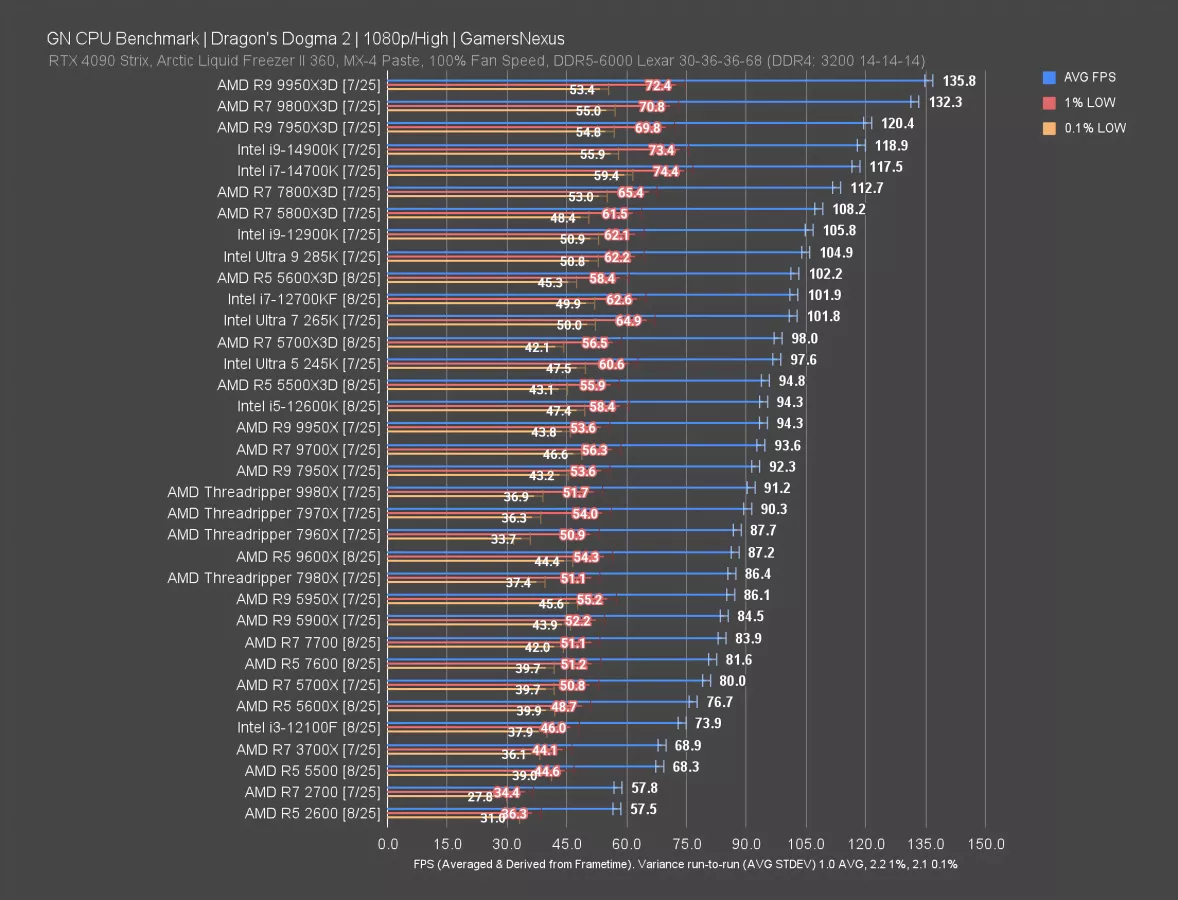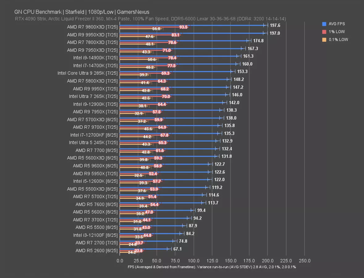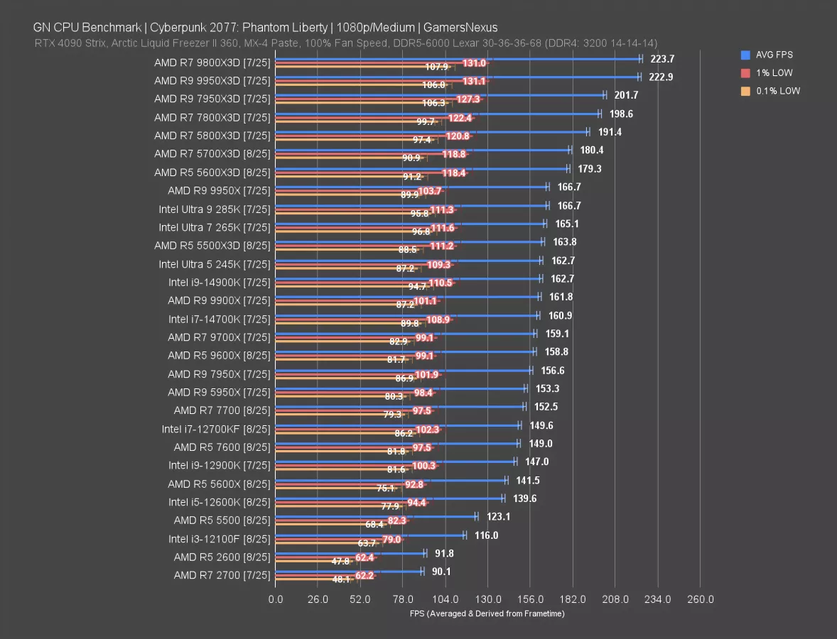 Baldur’s Gate 3 is up now. This one is lightweight on GPUs, but can be surprisingly good for showing CPU scaling. The 9950X3D (read our review), 9800X3D, and everything below them prove that. We’re still scaling all the way up to the best two CPUs on the market.