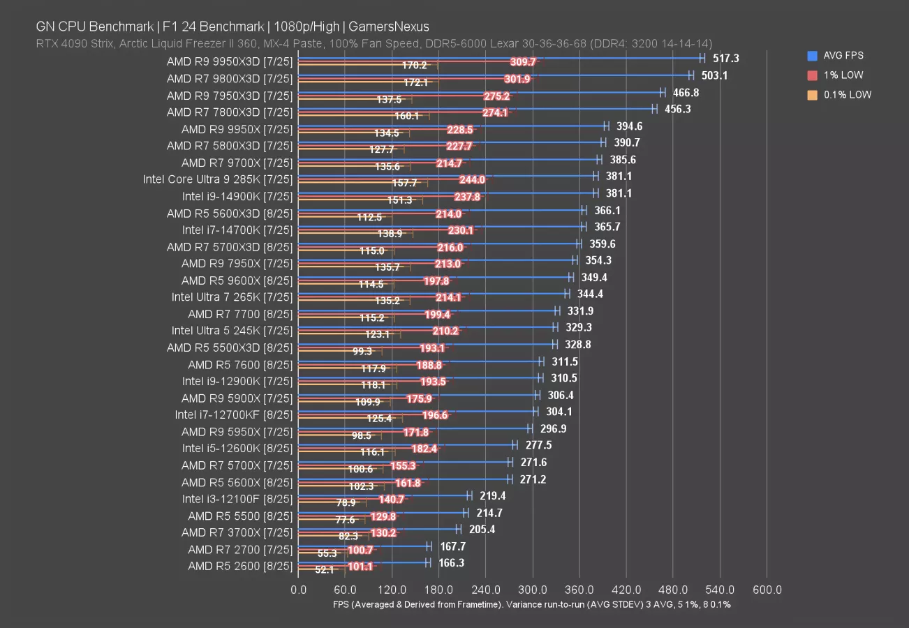 1440p is more or less the same, but we’re including it just to show scaling. Everything is a little bit truncated by the imposition of more GPU load, but particularly the 9800X3D and 9950X3D. These two CPUs are now about tied, with everything down to the 7600 (watch our review) at least occasionally glancing off of the GPU limit, even if rarely.