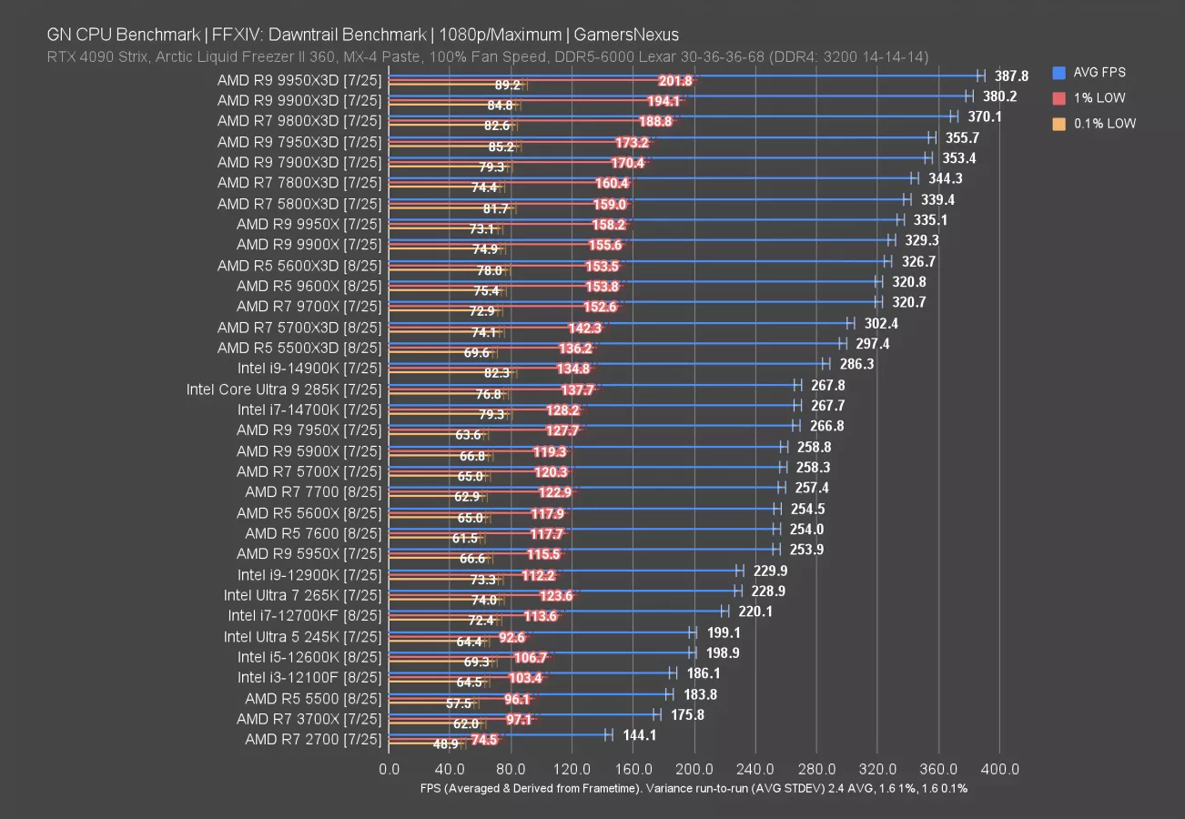 The 5500X3D manages to outperform the 14900K (read our review) and Intel 285K (read our review). We’ve talked about this before, but Final Fantasy’s chart flipped from an update a couple years ago now: It used to be that Intel held the entire top half of the chart, and now it’s AMD. That remains true with the X3D AM4 parts while the non-X3D AM4 variants fall below some of the Intel CPUs.