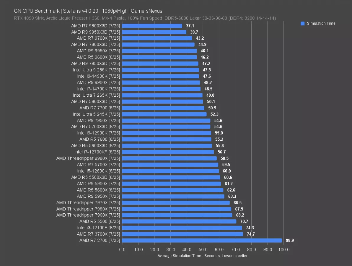 Stellaris simulation time is up first. This benchmark is CPU-intensive and also a gaming benchmark, but it’s useful for its real-world representation of something beyond framerate. This lets us look at the actual time required to simulate change in the game, meaning the impacts are felt in real time.