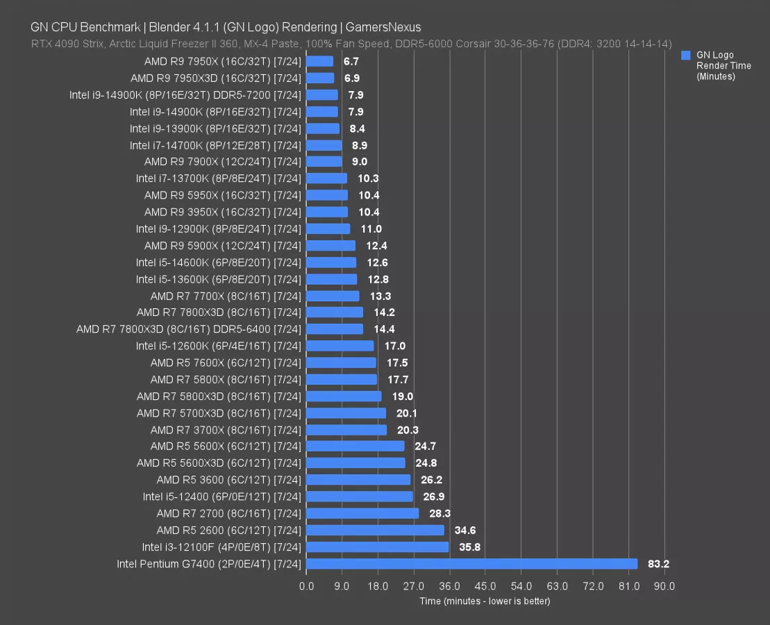 The 3700X is able to leverage its extra cores over the 3600 here, landing at 20 minutes to complete the render versus 26 on the 3600. That’s a noteworthy reduction in time requirement of 22.5%. The AM4 X3D CPUs don’t benefit from their extra cache here. More cores makes the most impact, followed by higher frequency. The cache doesn’t come into play much. The 7950X is the current chart leader, followed by the 14900K from Intel.