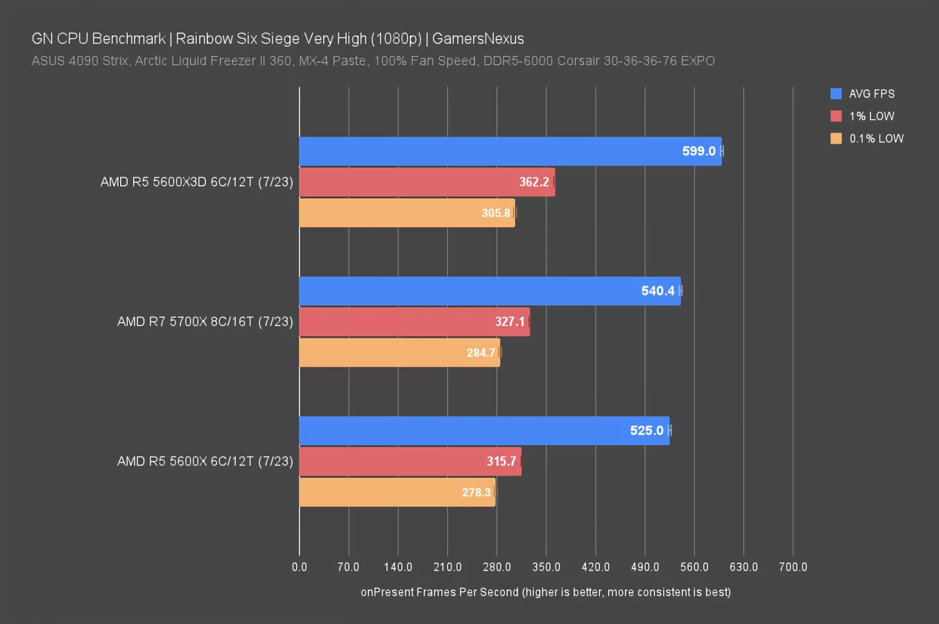 The 5600X3D held about 600FPS AVG. For reference, in the pre-patch tests, the 13900K was over 800FPS -- there’s plenty of room for scale left here. That means the 5600X3D gained about 14% over the 5600X in average framerate performance, with lows also boosted. The lead over the 5700X is only 11% in this one.