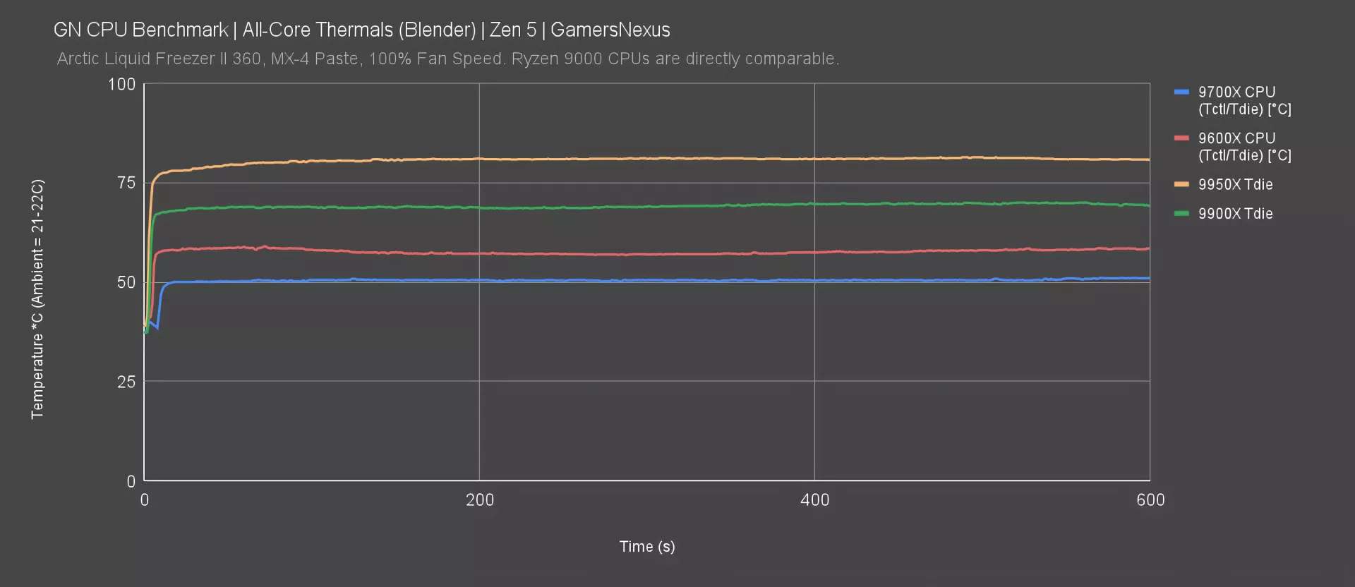 The 9700X ran at about 51 degrees Celsius in a 21-22C test environment. The 9600X ran at 58 degrees in the same controlled conditions and at steady state. The 9900X ran at 70 degrees Celsius, with the 9950X at 81 degrees Celsius. Under identical conditions, we’d generally advise a 360mm liquid cooler for a 9950X if you want some room to drop fan speeds for noise levels. The 9900X would do fine with a high-end air cooler or a 280mm liquid cooler. The 9700X and 9600X can use any number of affordable air coolers on the market.