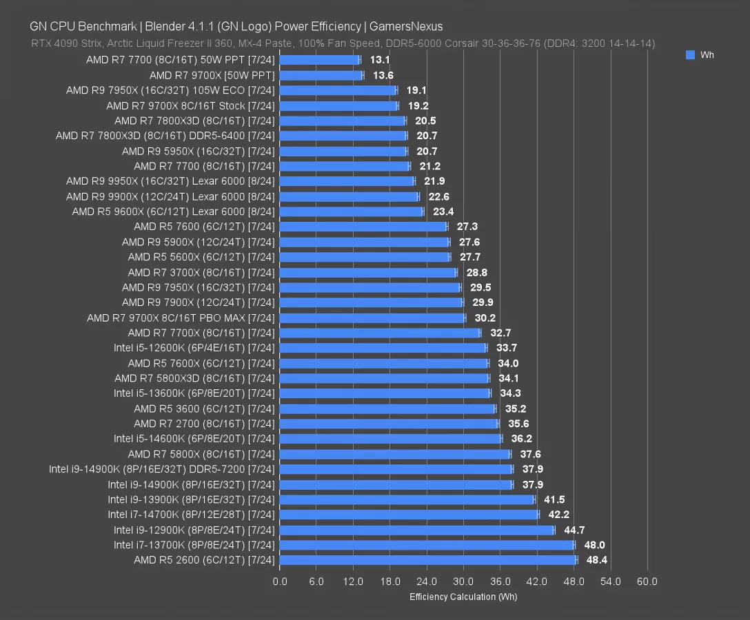 For this one, factoring in total render time in Blender of a frame from our GN logo animation, the 9900X ranked at 22.6 Wh. That puts it about equal with the 9950X, so it’s overall more efficient than the 7900X (which had a 29.9 Wh result). The improvement is huge, as we’ve seen consistently in this test: We’re seeing a reduction of 24% in Watt-hours used during the test, with comparable improvements from the 7950X (watch our review) to the 9950X that we looked at yesterday. The 9700X kicked this all off by achieving the top score for an out-of-box CPU (at 19.2 Wh, behind only the 7950X in Eco Mode and the PPT-limited demo tests). This was a big improvement on both the same-TDP 7700 and the higher TDP 7700X. Zen 5 is looking good in this comparison.