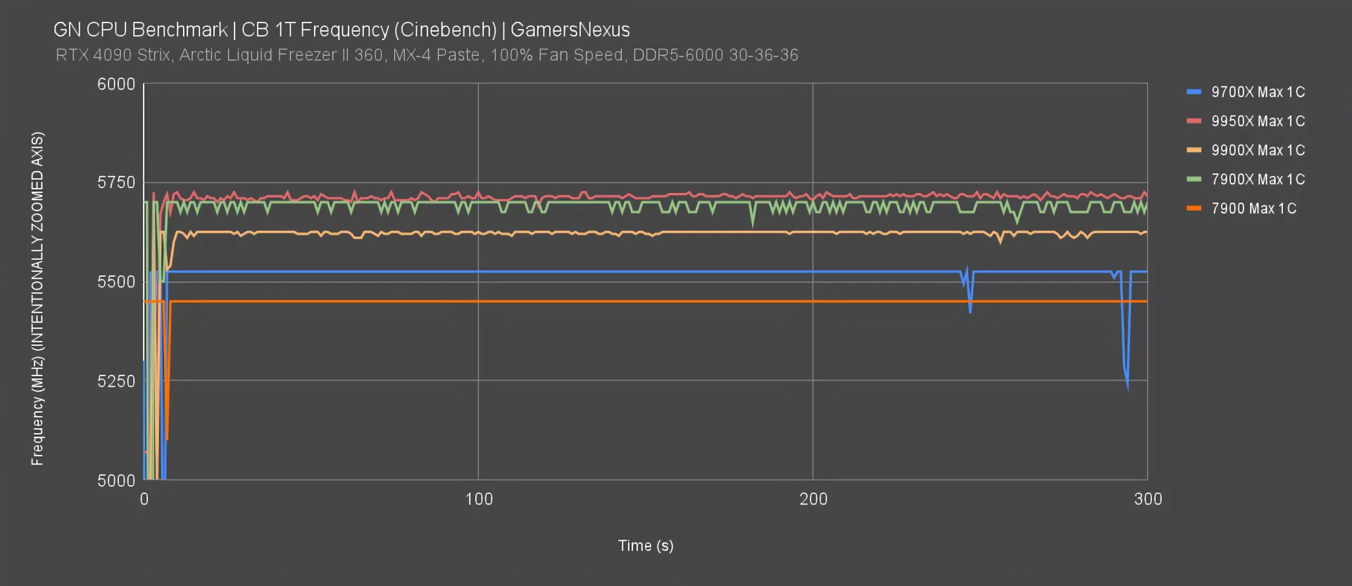 Finally, the 7900 maxed-out at a flatlined 5450MHz, below everything.