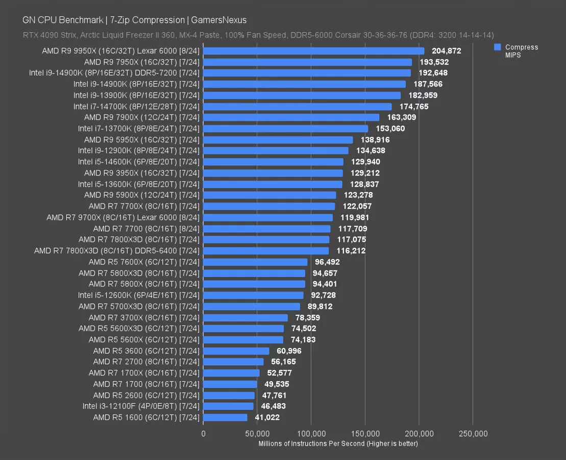 File compression with 7-Zip is next. In this one, the 9950X completed 205K MIPS (millions of instructions per second) when stock, an improvement of 5.9% over the 7950X’s result. For that same generational perspective, here’s how it lines up: