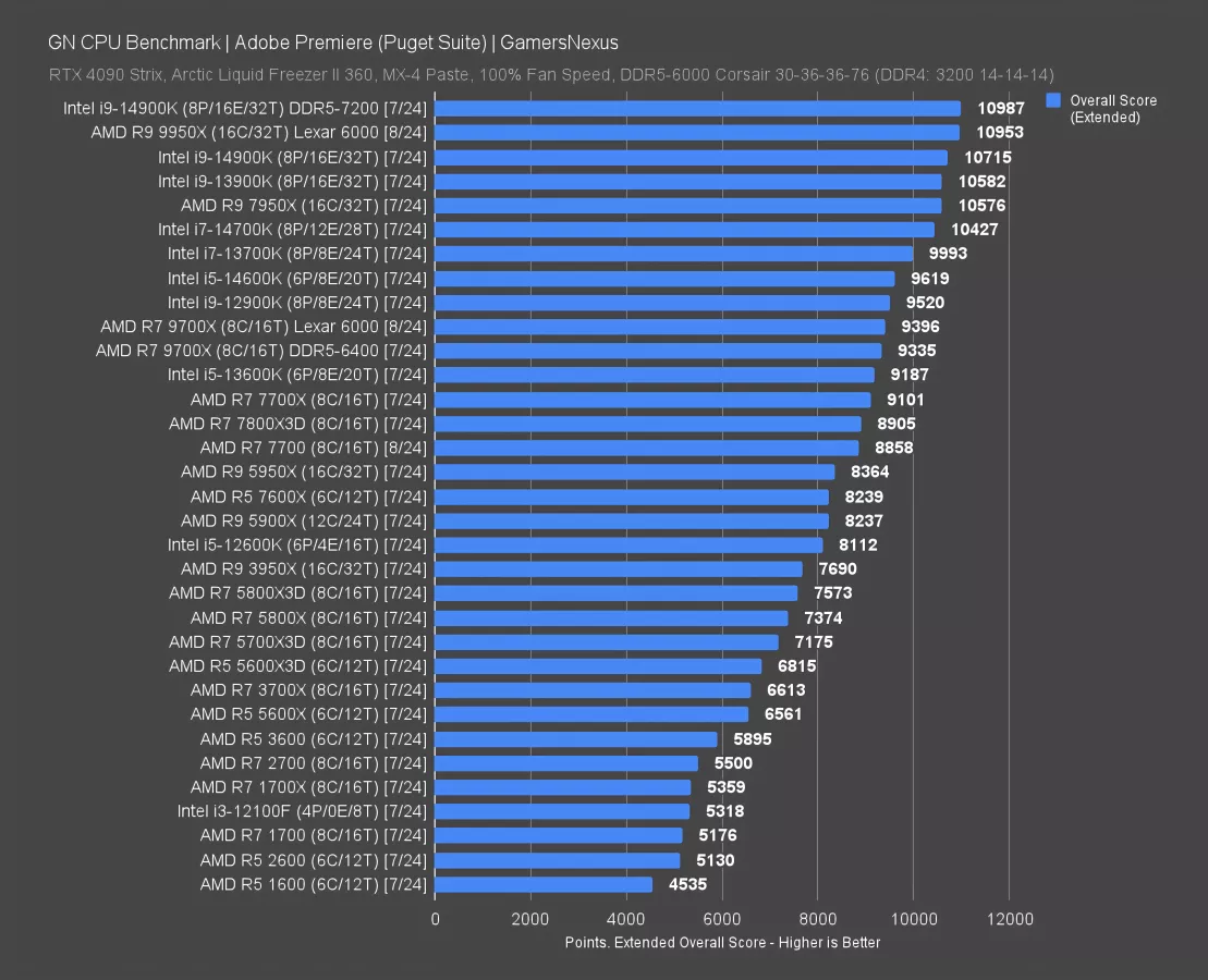 In Adobe Premiere, the 9950X scored almost 11,000 points for the extended benchmark. The 14900K flanks it with the standardized and faster memory, but ultimately, these are equivalent. Against the prior generation, the 9950X improves 31% over the 5950X (which is down near the 7600X) and 42% over the 3950X.