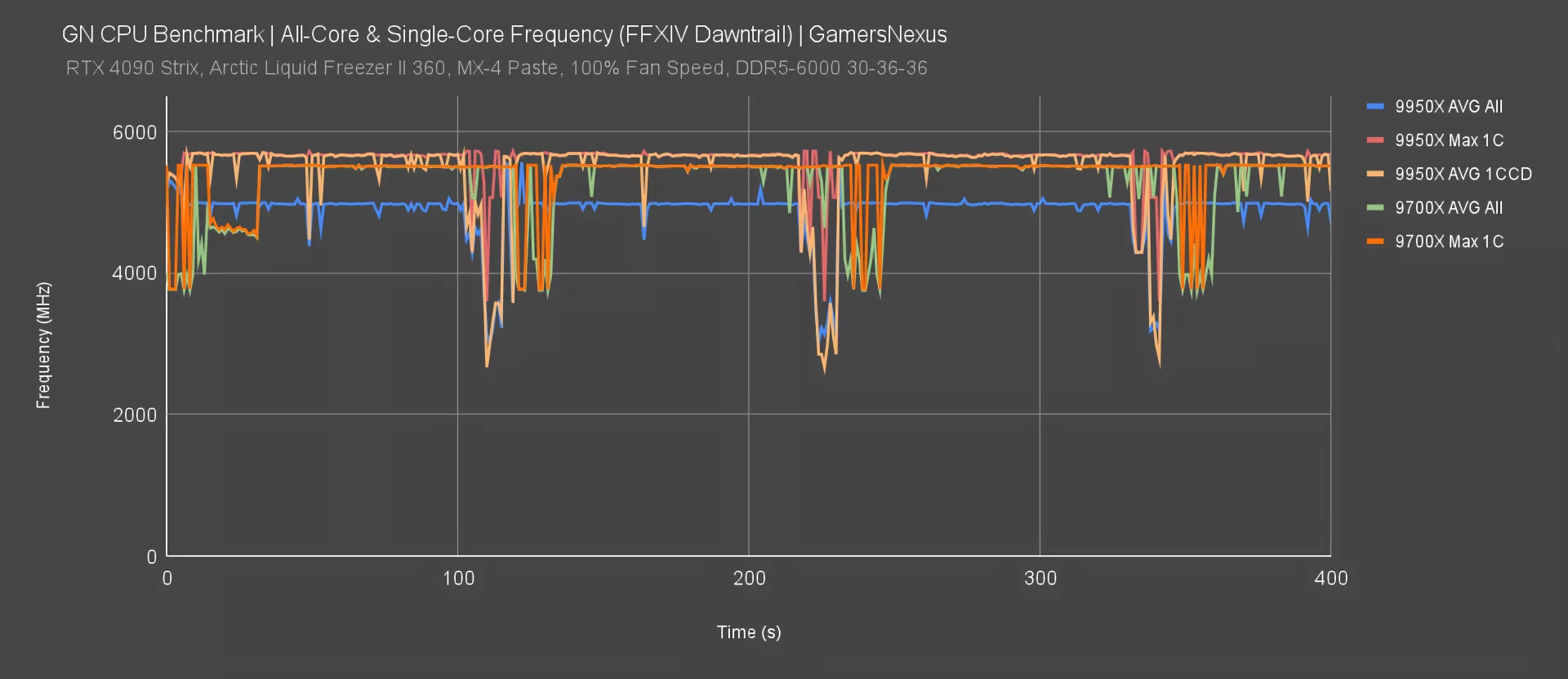 To better understand what’s going on in Dawntrail, we plotted the frequency of the 9950X and 9700X during this workload. We found that the 9950X’s all-core average was about 4975-5000MHz, which is lower than the 9700X’s all-core average of 5500MHz [but that’s because it’s averaging an inactive CCD. We’ll look at that soon. You can see that the 9700X’s all core is just below its maximum single core frequency.