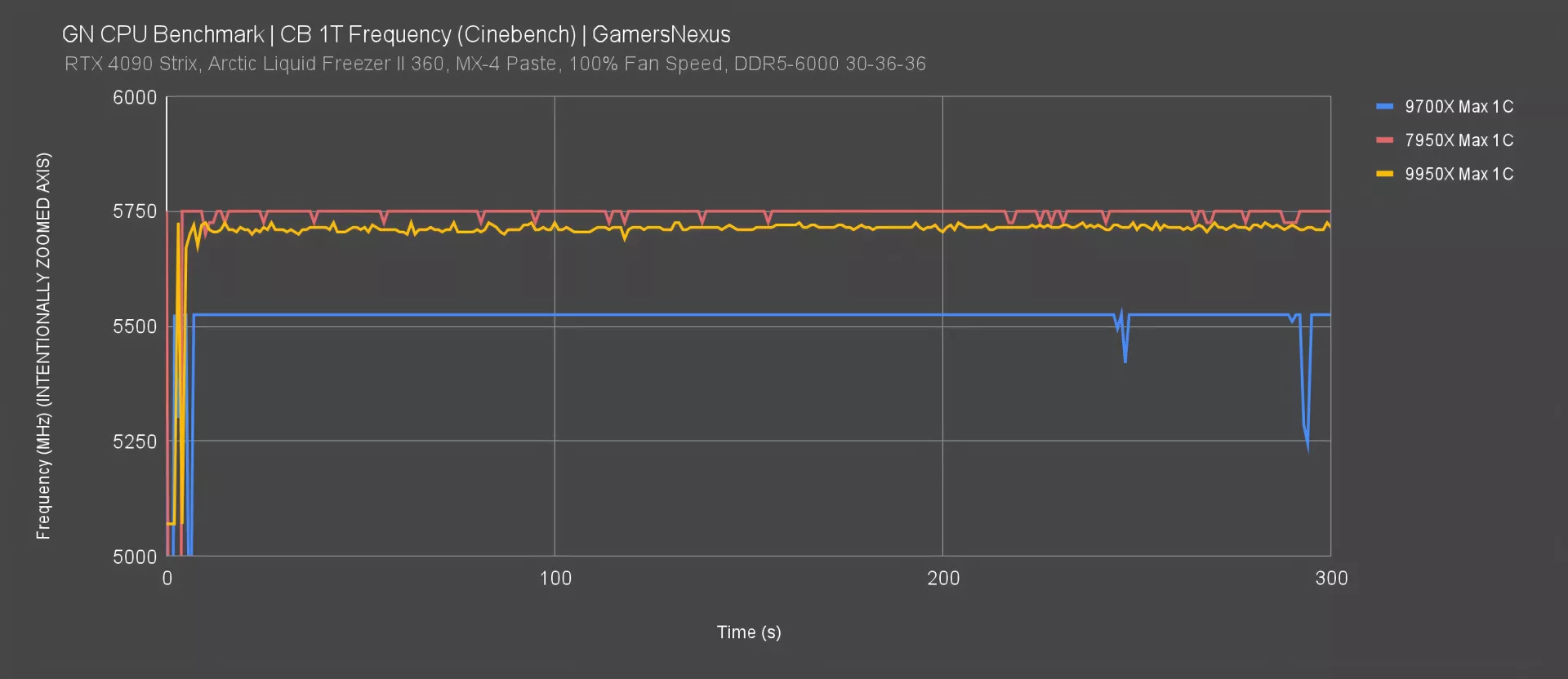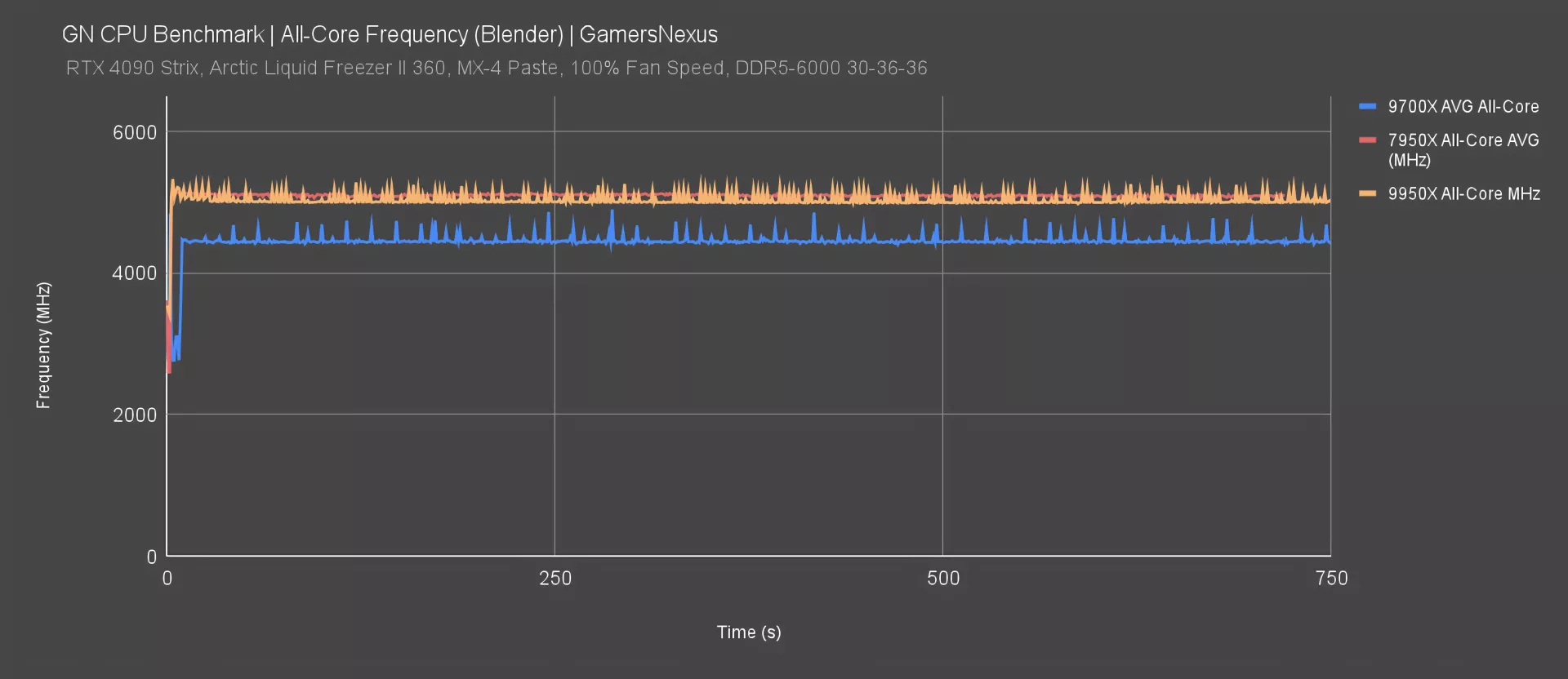 Here’s the all-core frequency when the CPU is fully engaged on every thread in Blender. The 9700X was around 4500MHz here, +/- 20MHz. The 7950X plotted around 5100MHz all-core previously.