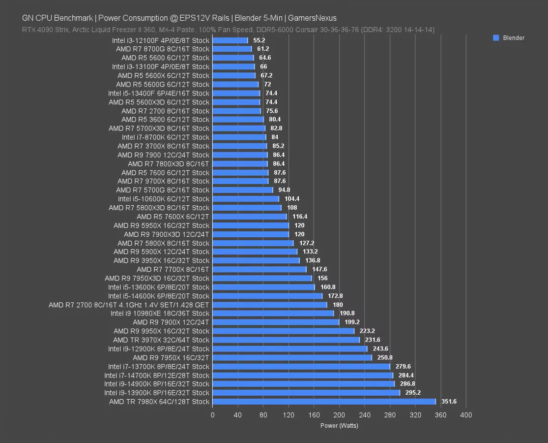 Power consumption at the EPS12V rails in just Blender is up now. This isn’t an efficiency chart, just the peak power consumption in a worst-case scenario. You’d use this to help buffer PSU requirements.