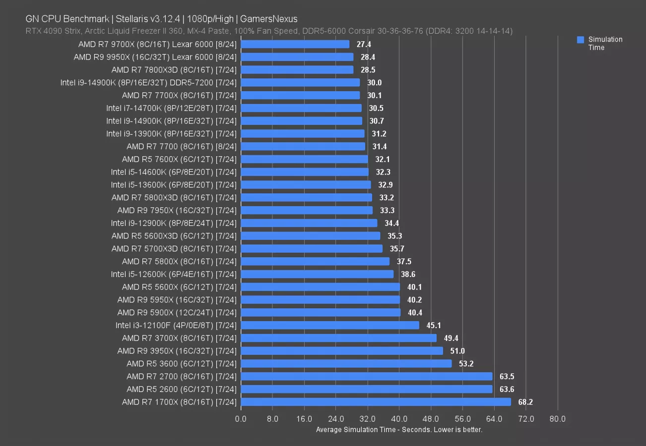 Stellaris posts results that have the 9700X outperforming the 9950X slightly. The reduction in average simulation time is 1 full second, or about 3.5% time reduced. The 9950X is also tied with the 7800X3D, with this being one of the only tests where we saw the 9700X leverage its changes to pull ahead. The 9950X has the same architectural benefits, so it’s up here as well.