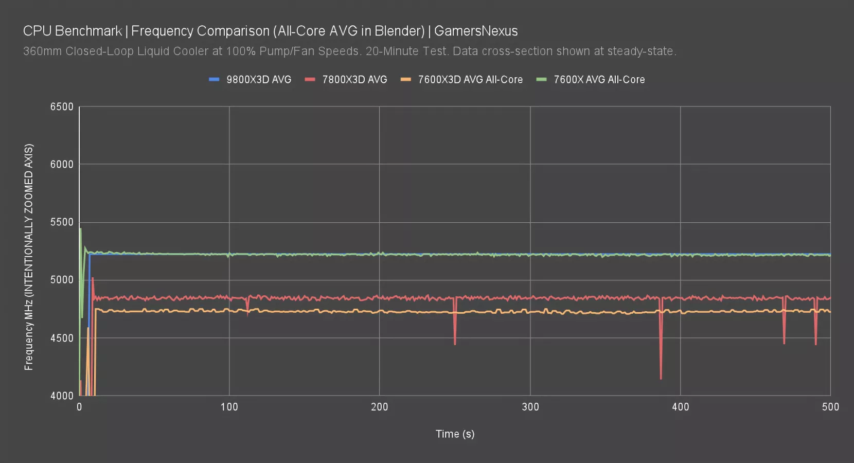 Here’s an all-core workload. The 9800X3D we just reviewed ran at about 5225 MHz average, which is an impressive clock to hold for a 3D V-Cache part. It’s also a flat hold of the frequency thanks to the extra power budget. The 7800X3D fluctuates more due to the power constraint, holding around 4850 MHz on average.