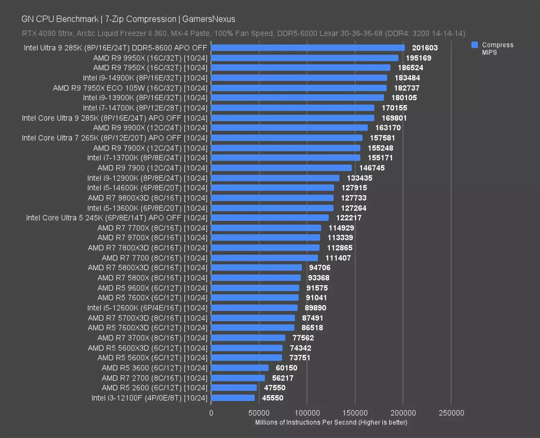 In 7-Zip file compression, the 7600X3D ended up completing about 87K MIPS, putting it ahead of the 3700X and behind the 5700X3D. The 7600X is again better, at 91K MIPS, or improved by 5.2%.