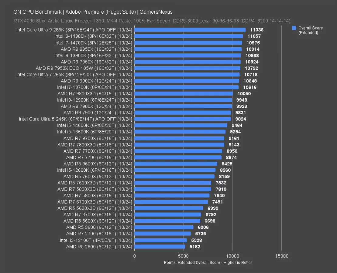 Adobe Premiere is tested with the Puget Suite, using a mix of RAW performance, intraframe, effects, and processing. The result is in aggregate points.