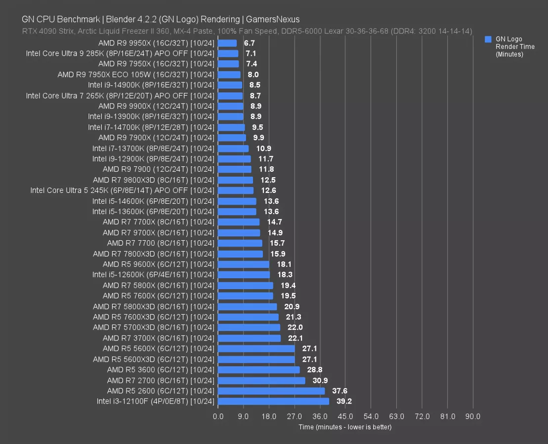 The 7600X3D is beaten by the 12600K, 5800X, and many other CPUs. Blender scales cleanly with thread count, and that shows here. The 285K is also relatively competitive in this particular test, as are the 265K and 245K.