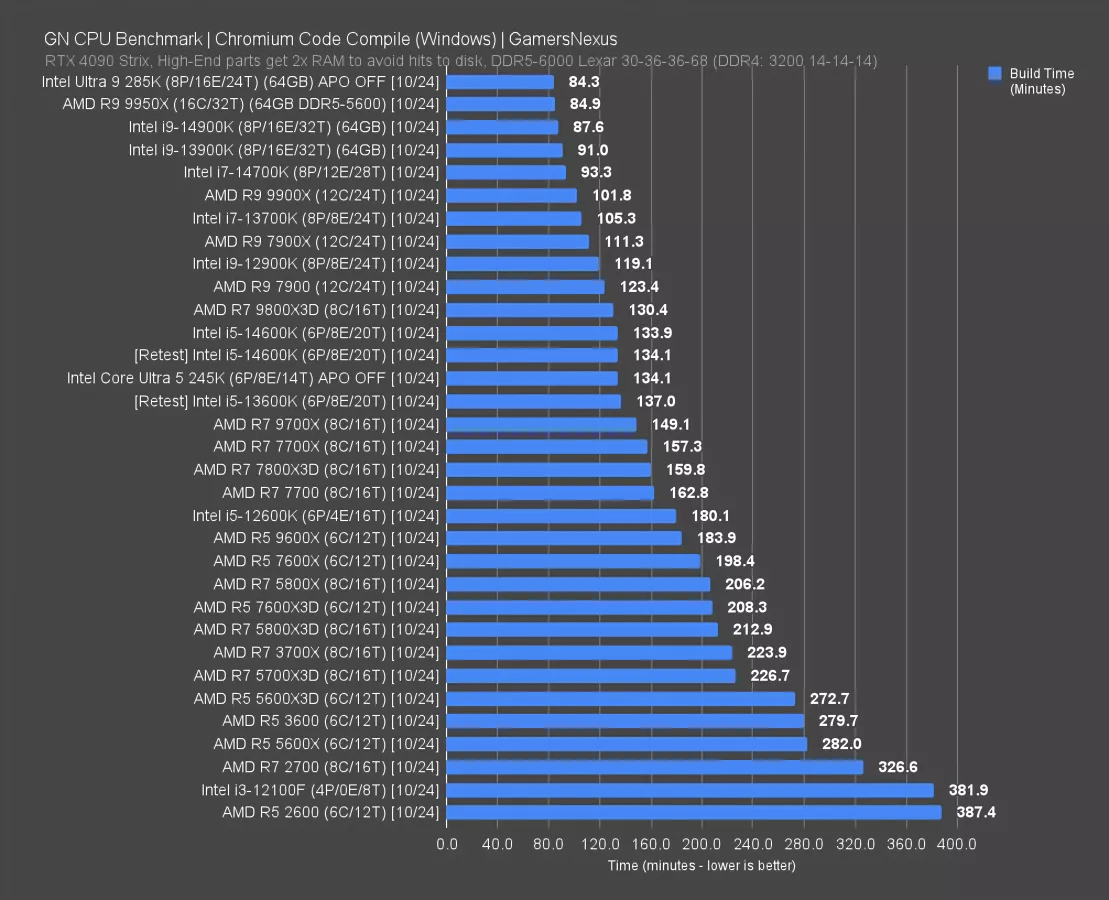 The 7600X benefits from a time reduction to 198 minutes in this test, with the 9600X and 12600K ahead of that.