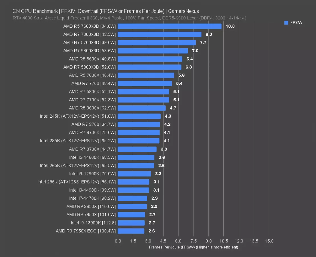 The end result is a 10.3 FPS/W rating, the highest we’ve seen, against 8.3 FPS/W on the 7800X3D. The 7800X3D is reaching the upper bound of what it can achieve for performance: It’s possible that this number increases with the launch of the RTX 5090, but for now, it’s stuck at 8.3 FPS/W. The 7600X original part pulls a little more power and performs far worse, landing it down at 5.6 FPS/W. That’s still ahead of anything Intel has to offer, including the 245K at 4.3 FPS/W, but nowhere close to the 7600X3D.