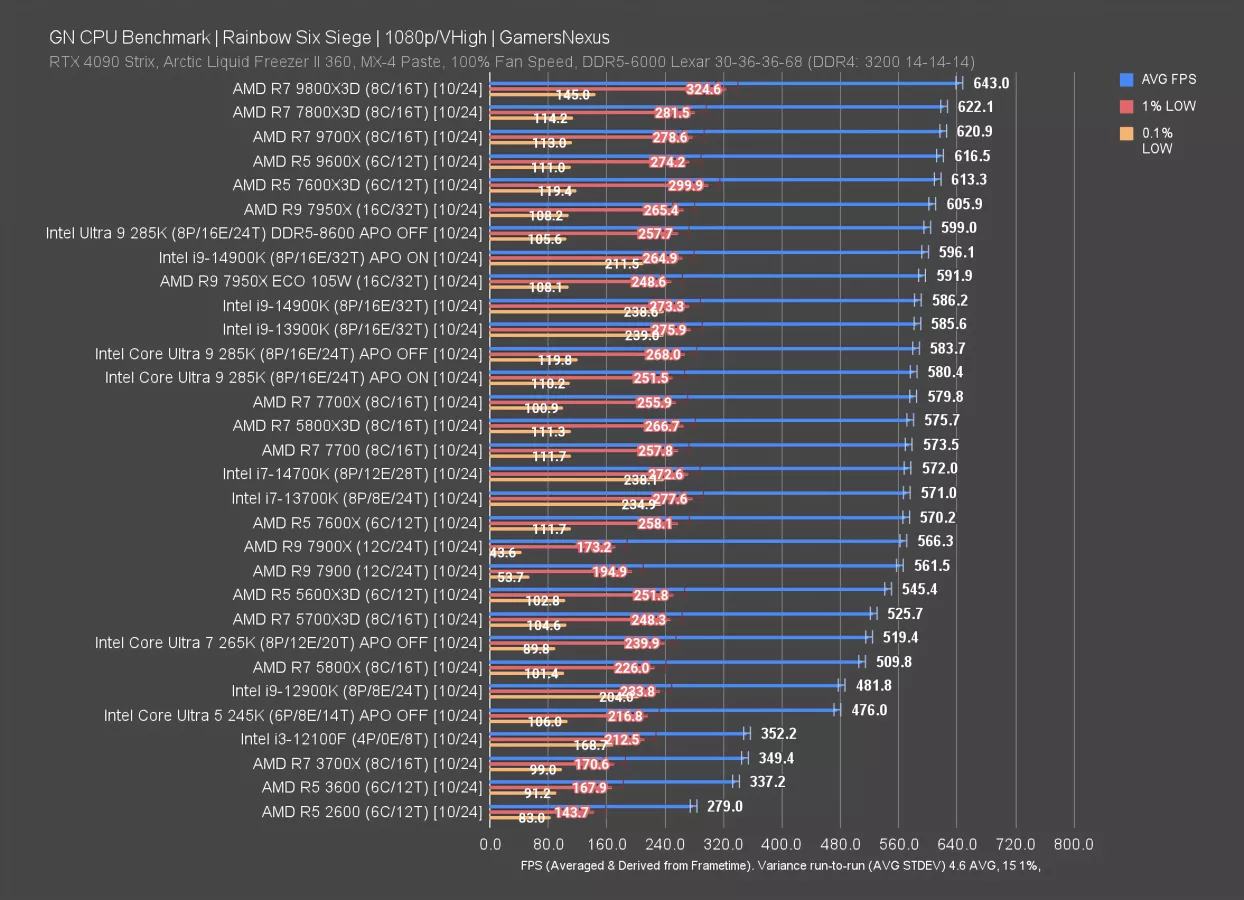 The 613.3 FPS result has it up alongside the 9600X and below the 9700X (read our review). The 7800X3D ran at 622 FPS AVG -- again, sorry, 622.1 -- which means it holds a 1.4% lead. That’s basically error. These CPUs are functionally the same, with lows differentiated only by how wildly variable this particular game is.