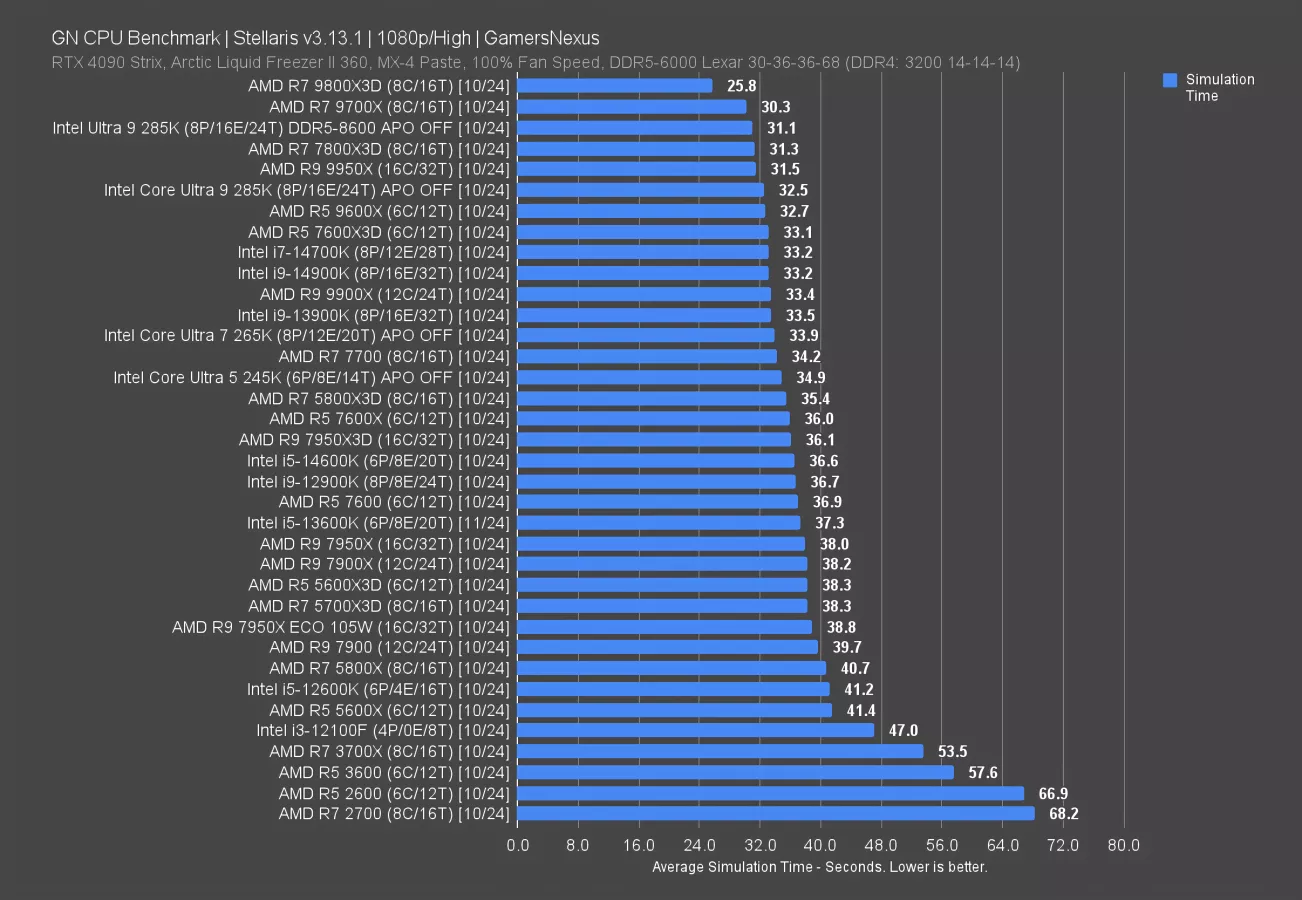 In Stellaris, the 7600X3D required 33.1 seconds to complete the simulation. This reduces the time required from the 7600X’s 36-second entry by 8%. The 9600X, from Zen 5, outperforms the 7600X3D, benefiting from the overall Zen 5 uplift we’ve seen in this specific game. Aside from that, everything else above the 7600X3D is significantly more expensive, including the 285K at $630 but providing only a 1.8% reduction in time required to simulate.
