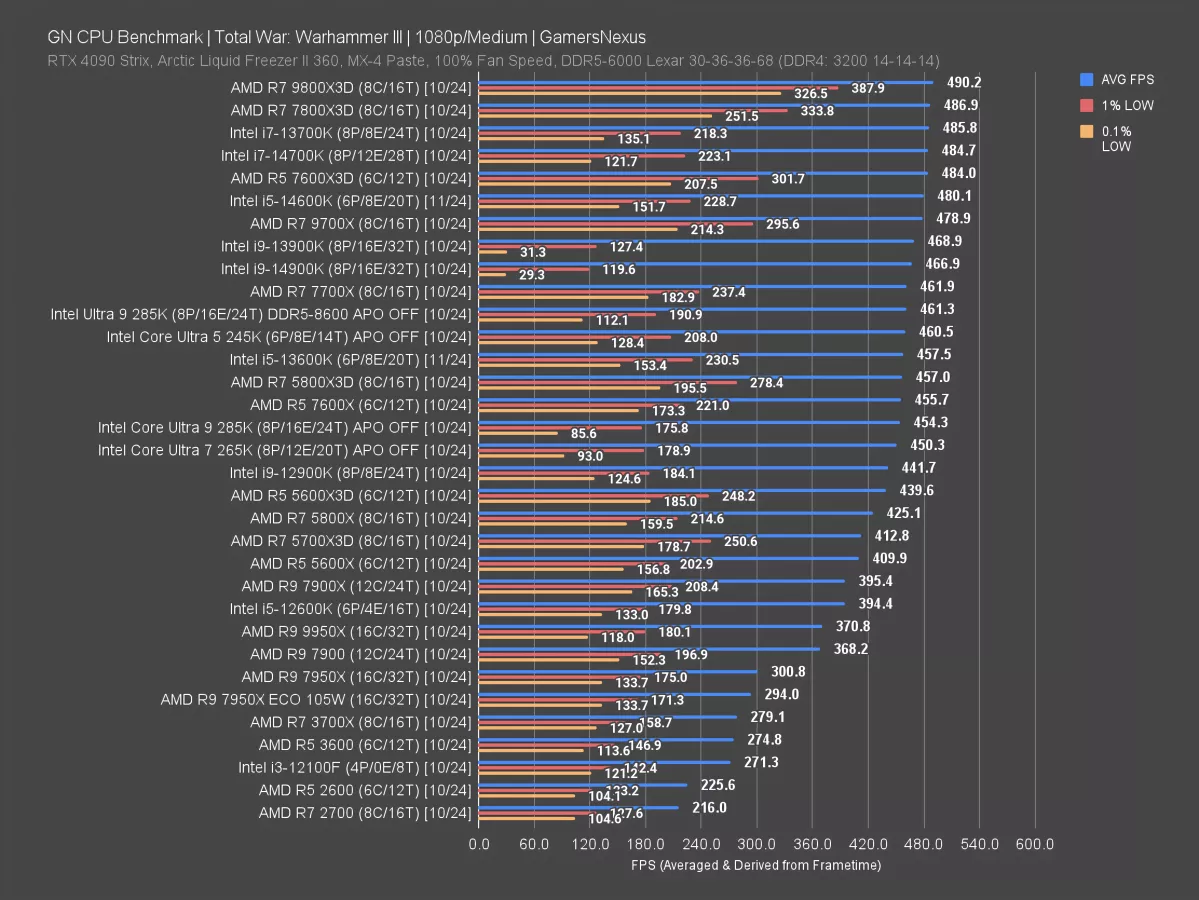 The 7600X3D is more typical: It ran the game at 116 FPS AVG, which allows the 9800X3D another 38% lead. The lows remain impressive on the 9800X3D, followed by the prior 13 series and 14 series CPUs as the next most impressive for lows. The 7600X3D is overall “fine” for lows, but its position is predictable within this stack.