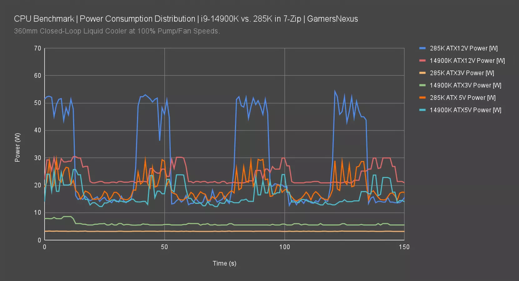 ATX3V power is comparable on both and within 2W. ATX5V power isn’t easy to call a simple average since it fluctuates so much: The range is 14-30W on the 285K+ASUS combination and similar on the 14900K, with peaks about 3-5W lower than the 285K. We don’t know if any of that power is getting used for regulators that might feed the CPU, but if any of it is, it’s not much. A lot of it is driving other components, like I/O.