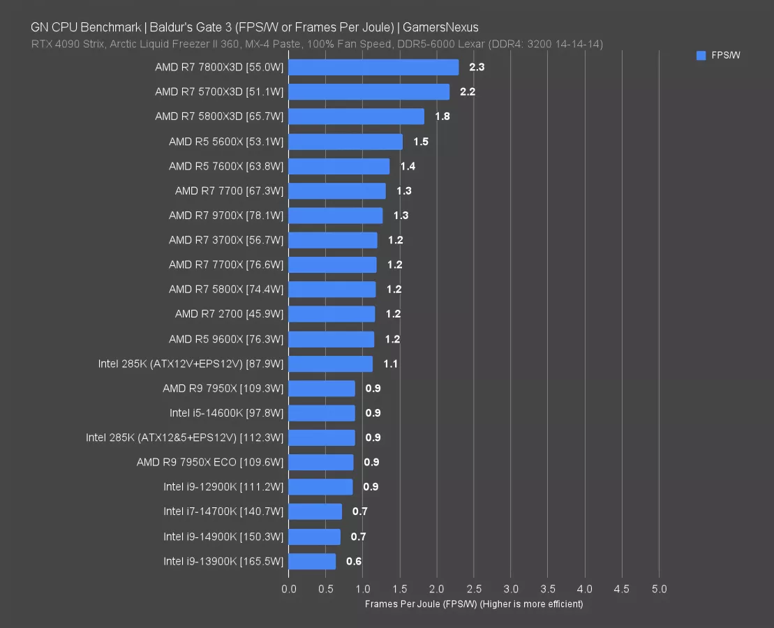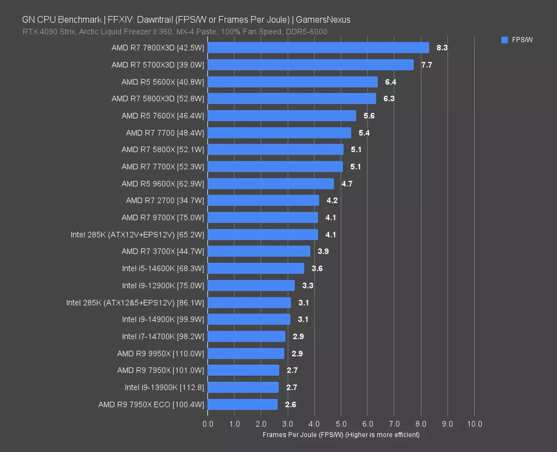 Finally, Final Fantasy 14 for efficiency. In this one, the 7800X3D led with an impressive 42.5W power draw while spewing hundreds of frames per second, allowing it a result of 8.3 FPS/W. That’s great. The 5700X3D keeps its second-place spot at 7.7. The 14900K ran at 3.1 FPS/W, so the 285K is 32% improved by these numbers. This is one where the 285K was regressive in performance against the 14900K -- and by sort of a lot, but we’ll come back to that. The result is reduced efficiency gains.