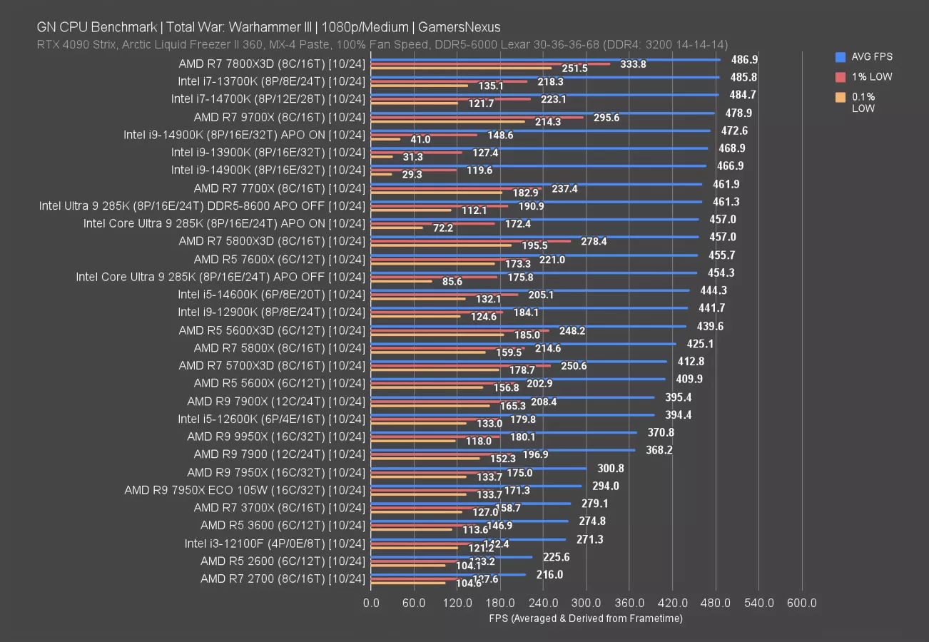 The 7800X3D establishes a 26% lead over the 285K, at 126 FPS to 100 FPS AVG. The 14900K leads the 285K by 4.5%, at about 105 FPS AVG.