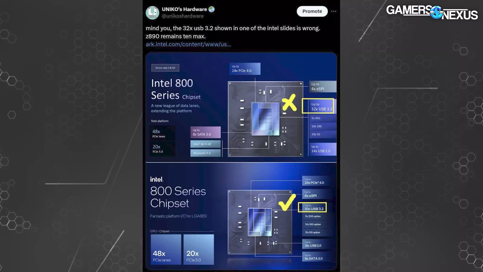 Intel even got its own specs wrong on the slide above where it said the chipset can support up to 32 USB 3.2 devices but actually it’s supposed to be 10. This is all to point out that Arrow Lake is really just not ready for launch.