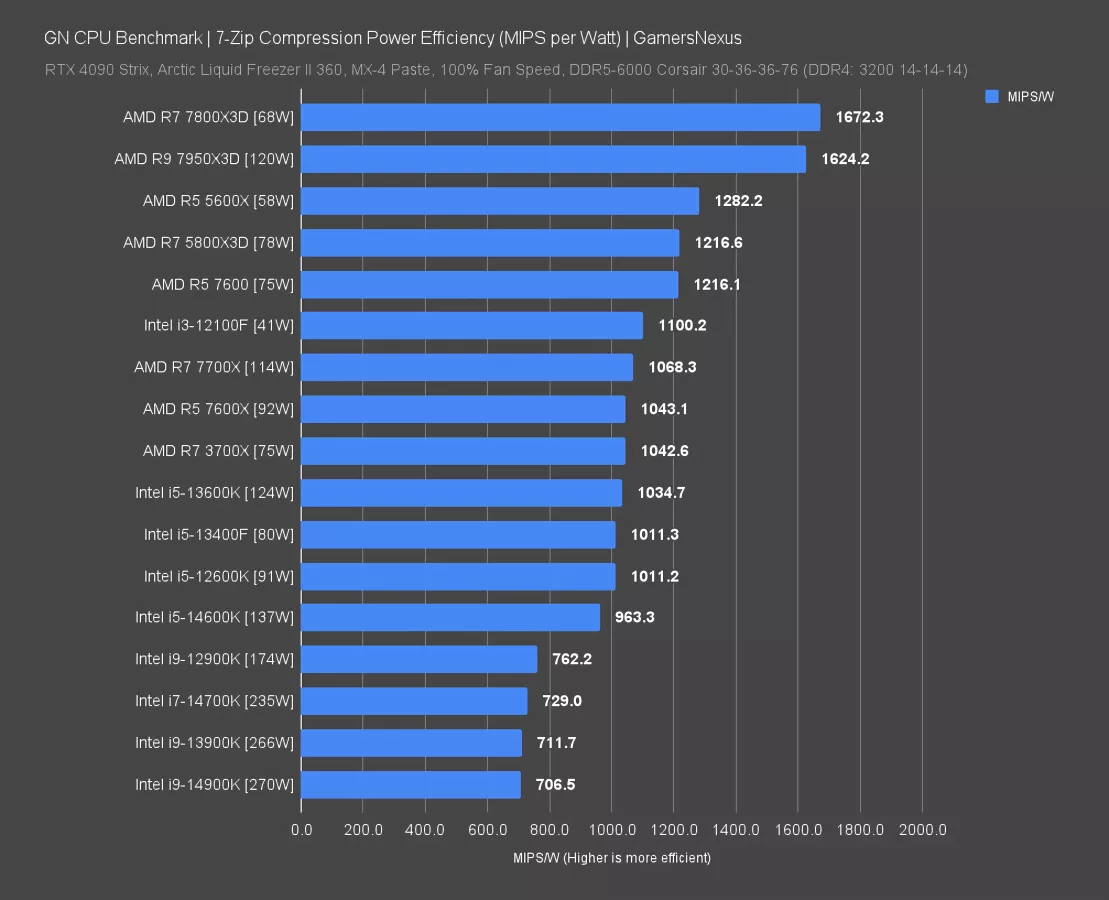 The 7800X3D leads this chart, despite middling performance for the actual compression rate. The 7950X3D follows it. Both of these are generally good bins with low vcore requirements, making them overall efficient here. The 5800X3D is next in order, then the 7600, then the 12100F. Intel’s 14900K performs the worst, at 707 MIPS/W, with the 13900K and 14700K close behind. All 3 of these CPUs are in excess of 200W, with the 14900K approaching the 290-300W figure we saw in Blender when stock.