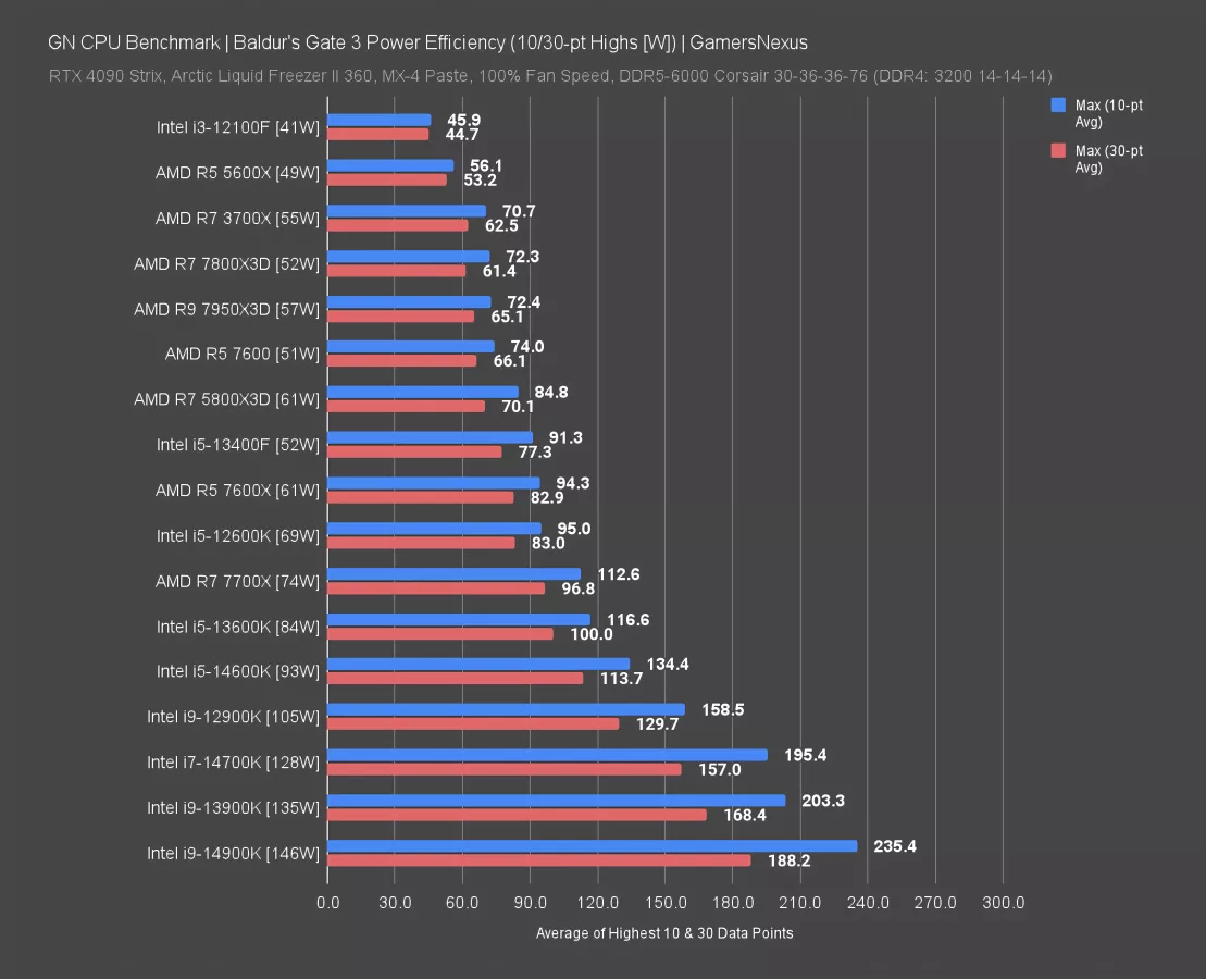 In Baldur’s Gate 3, which was overall a middling game for in-game power consumption despite generally high focus on the CPU, we still saw high spikes in the Intel i7 and i9 categories. The 7800X3D was also a significant percentage higher than the average at 72W. The 14900K was around 235W to its 146W average in-game load power draw.