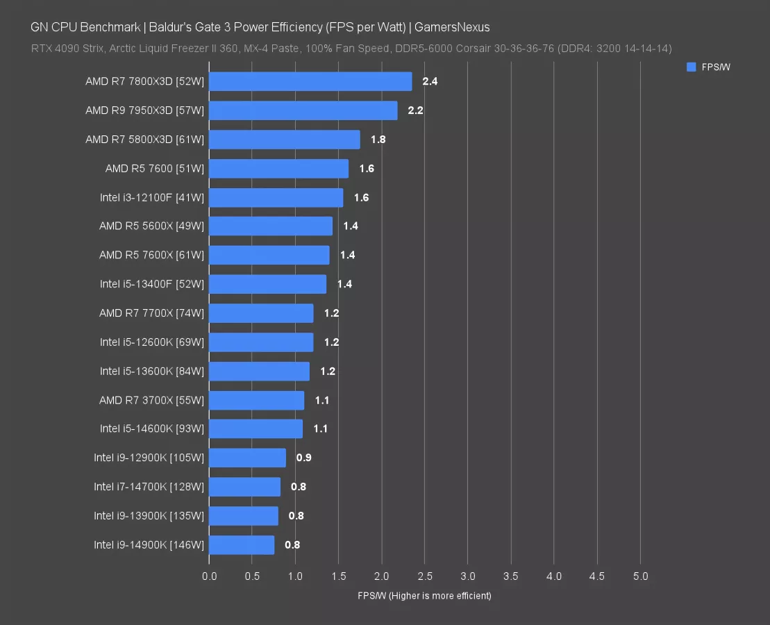 Here again, the efficiency advantage goes toward the X3D CPUs -- and that includes the 5800X3D, which isn’t anywhere near a GPU limit. The 14900K also wasn’t at its GPU limit, with the GPU Busy time well below our total frametime, and yet it remains the least efficient on this chart at 146W. The 13900K is alongside it and at 135W. Intel’s most efficient point on the curve is hit with the 12100F, at 41W and a 1.6FPS/W result. The 13400F is next in line for Intel.