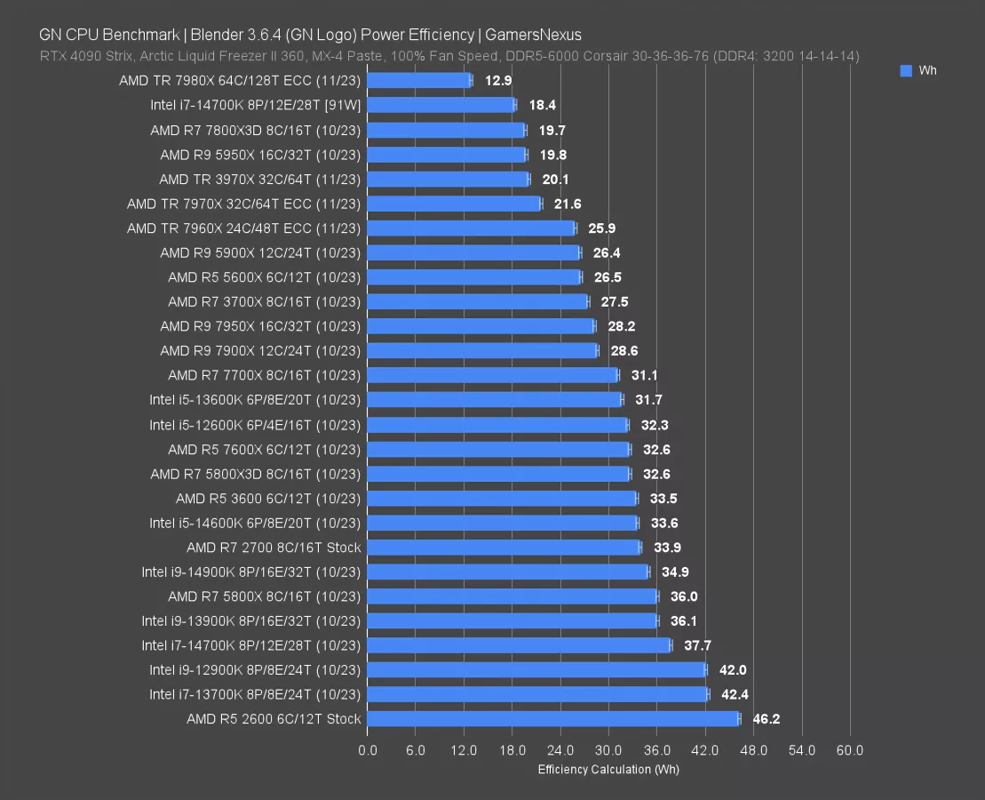 We’ll also provide a Wh chart for Blender, but now with an entry of the 14700K (review here) power-controlled. This increases its render time, but increases its efficiency.