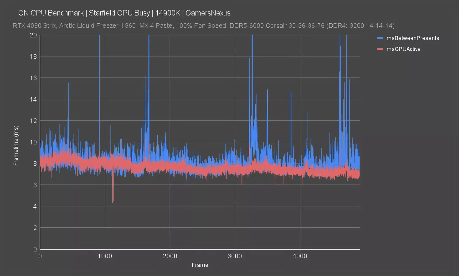 Let’s look at how busy that 14900K was with GPU scheduling. For this chart, we’re looking at GPU Busy, the new metric we’ve been talking about a lot lately. We have a couple videos talking about this in more detail (see here, here, and here), but the basics are that we’re showing you the total frametime from one of the test passes as mapped against the GPU Busy, or GPU Active, time synchronized. The closer they are to parity, the more loaded the GPU is.