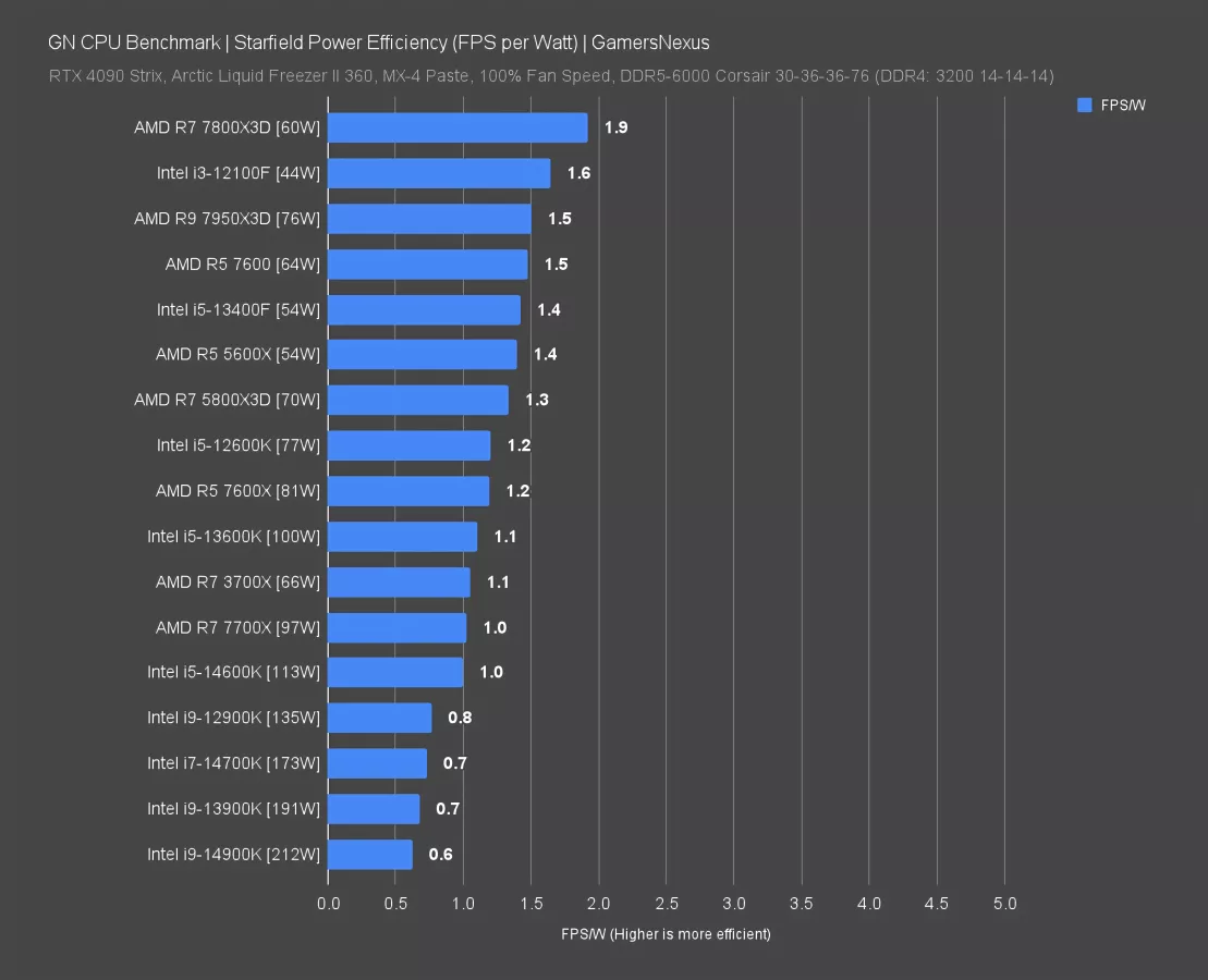 And... nope. That didn’t help. AMD, despite running generally lower framerate in Starfield than Intel, is still miles ahead for efficiency. The 7800X3D crushes it comparatively, with a 1.9FPS/W result. The i3-12100F does excellently here though, so it’s the true benefactor of the favorable Intel performance in this game. The 13400F also makes an appearance alongside AMD’s R5 5600X and R5 7600, so it too is doing well overall and gives hope for Intel’s efficiency.