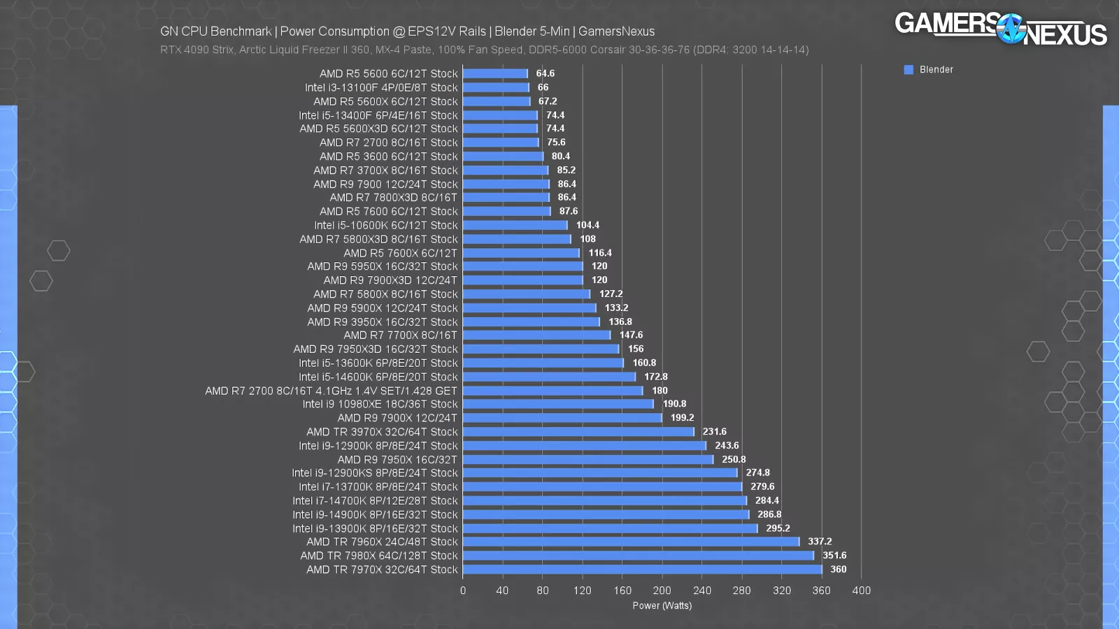 The goal is the scientific approach: We don’t care who wins or loses here. We just want to see what the results are. Today’s tests include gaming power consumption without constraints, efficiency calculations for gaming (not just Blender), power-normalized efficiency tests in some cases, and FPS-normalized efficiency tests with unconstrained power.