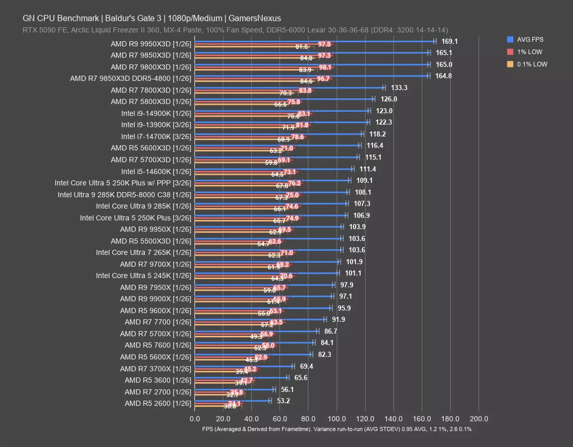 Against other CPUs, Intel’s 250KP with its Power PP outperforms the 9600X’s 96 FPS AVG by about 14%.