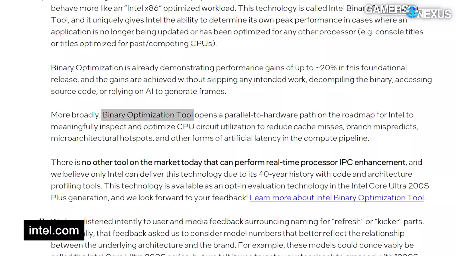 Intel also talked a lot of game about its Binary Optimization Tool, which it says “opens a parallel-to-hardware path [...] for Intel to inspect and optimize CPU circuit utilization to reduce cache misses, branch mispredicts, microarchitectural hotspots, and other forms of artificial latency in the compute pipeline.”