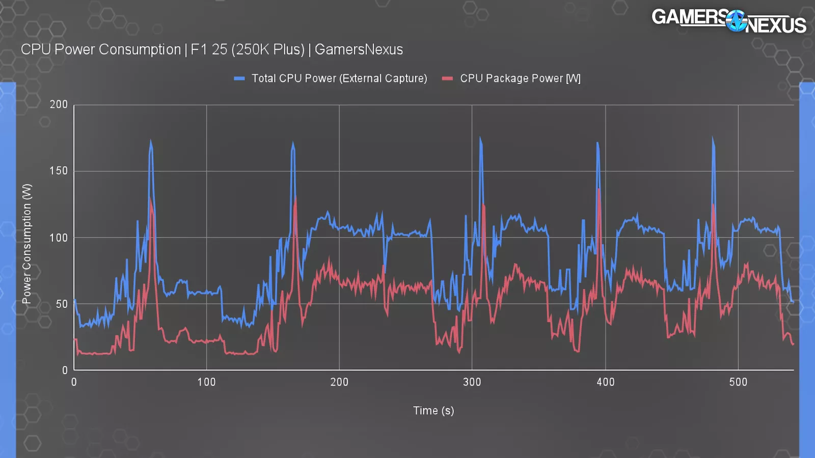 At F1 25 testing, you can see the loading screens and cycles with each of these spikes and dips. The peaks for externally captured power consumption landed at 171 watts with the valleys at 39 watts during low activity. During the game itself, such as around the 200 second to 270 second marks where we're driving around the track, we saw around 100 watts from external capture. CPU package power was closer to 70 watts range via software readings. Our traditional power tests are complicated. They typically take two days of full time just to process the data and arrange it for performance per watt on charge. Plus, we need to do about a week of testing to get everything updated. So, for now, we'll leave this one here just because of the time, but we may revisit it later.