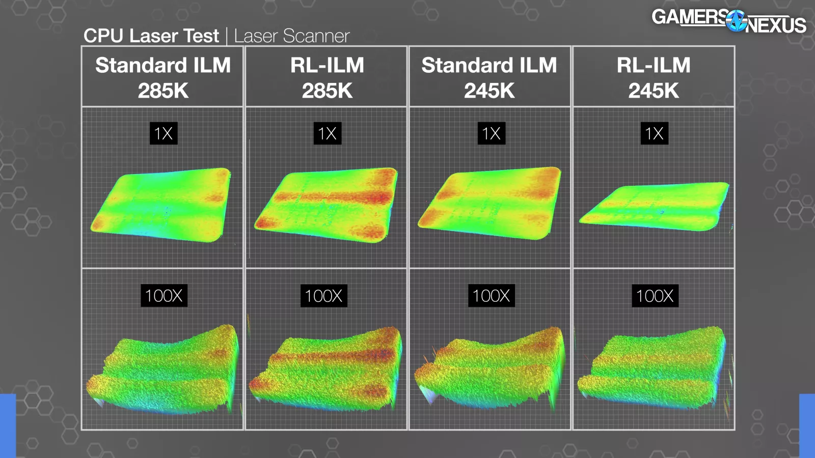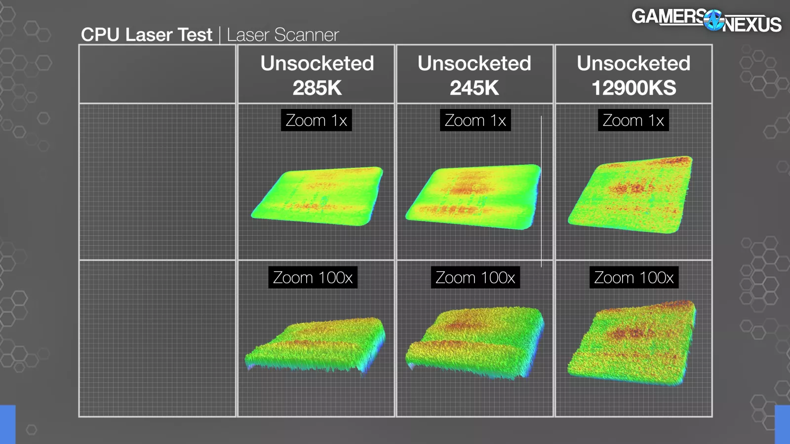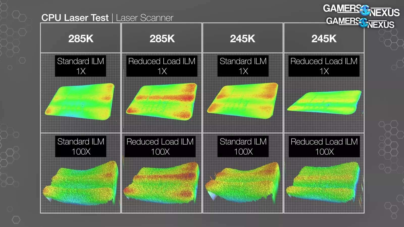 Intel is finally trying to unbend its CPUs, despite having to be on a bender to buy a $630 285K right now. Today, we’re using our laser scanner to look at the deflection in the CPU heat spreader from the different loading mechanisms, including these scans of the 285K (read our review) and 245K with different coolers installed. Today’s testing also includes specialized pressure scanning to produce pseudocolor images of pressure distribution across the IHS surface, very brief thermal testing to look at the differences with Noctua’s LBC (Low Base Convexity) flat coldplate, and we’ll look at the mechanical aspects.