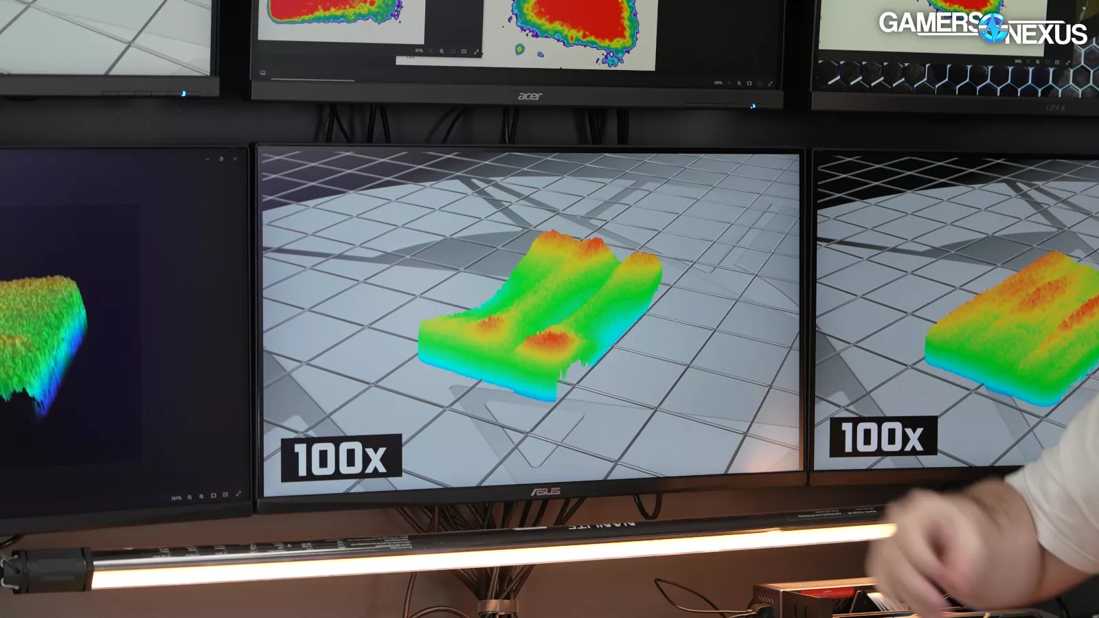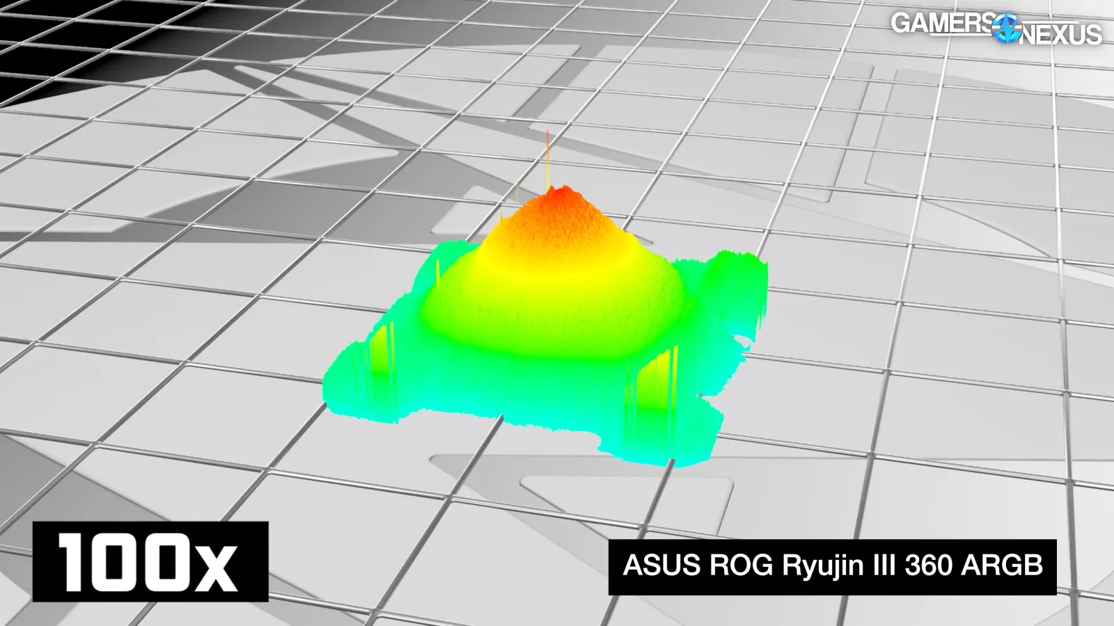 Scaling it 100x, we get this almost comical tower protruding from the coldplate. This helps us see the steep slope as ASUS applies massive pressure dead-center with its coldplate design. This is sort of a hamfisted approach and version of what Noctua did more precisely with the D15 G2 for LGA 1700, except Noctua had more nuance in the exact shape of the convexity, which will better align with the concavity in LGA 1700 CPU heat spreaders previously. It’s similar to what we saw in the $60 Thermalright liquid cooler, which managed to brute force its way in performance thanks to similar protrusions.