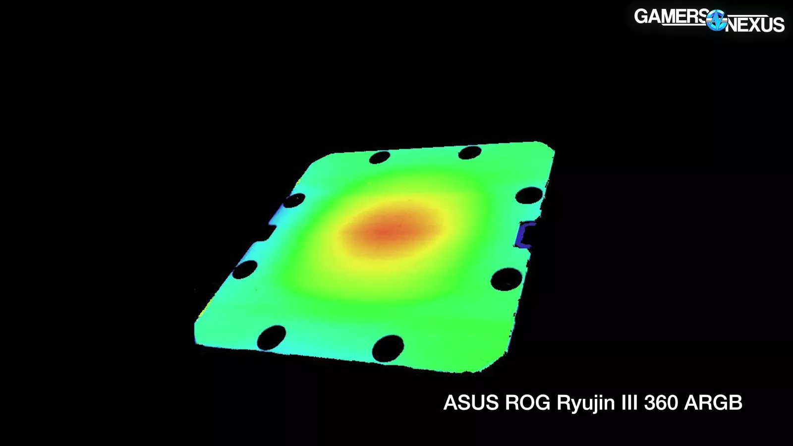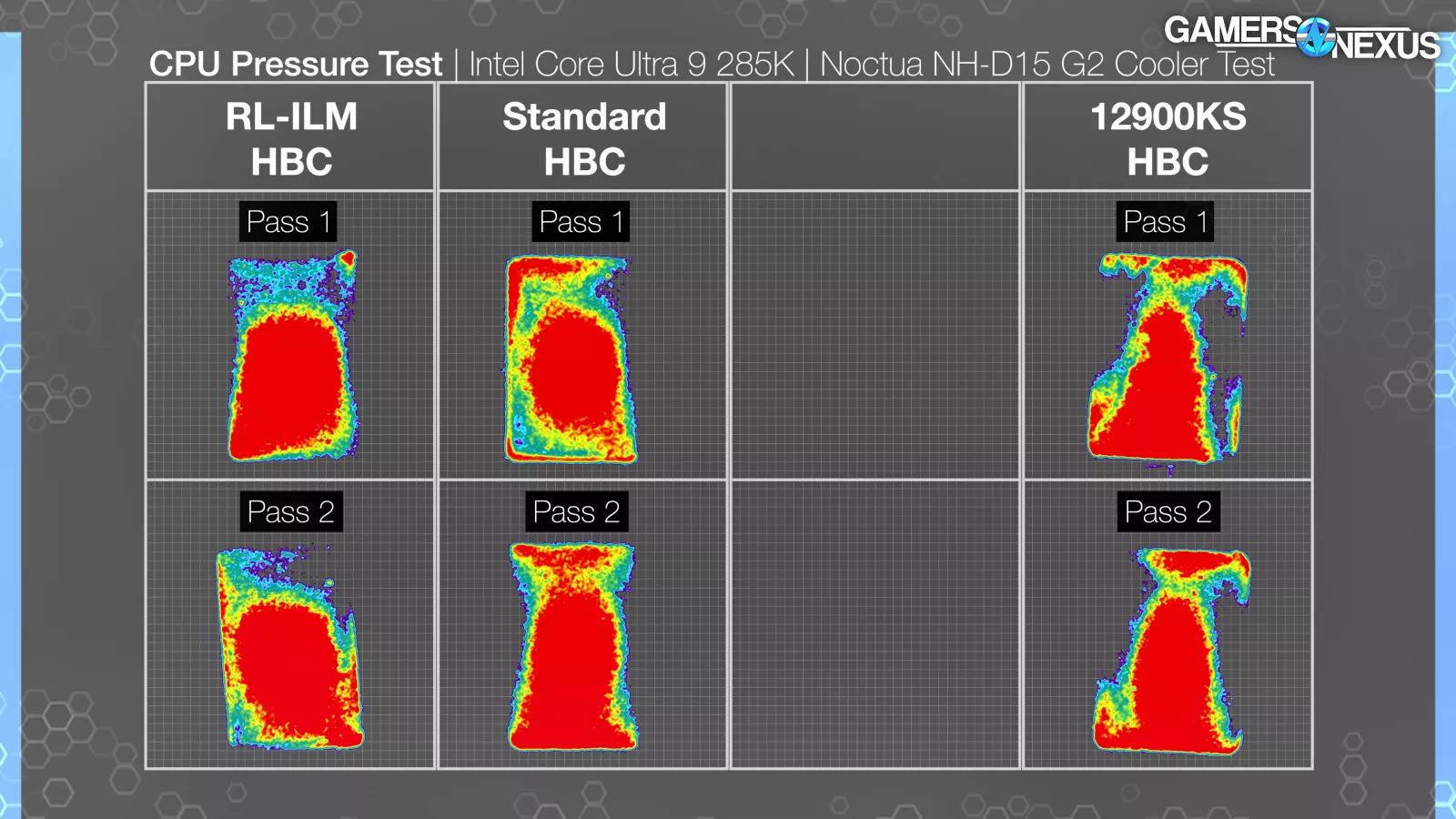 Ultimately, what we see is that ASUS’ older brute force approach gets a better pressure distribution on the prior LGA 1700 socket than on the new ARL 285K socket, which is thanks to the massive central protrusion. This is the approach Thermalright took with its $50-$60 liquid coolers previously as well. It’s relatively hamfisted, but works, whereas the more carefully shaped approach of air coolers like the D15 G2 and the Scythe FUMA 3 are technically a better pressure match; now, that said, a 360mm liquid cooler is still “better” (with regard to capability) overall, and it will cool better, but the Ryujin could improve with more purposeful coldplate shaping.
