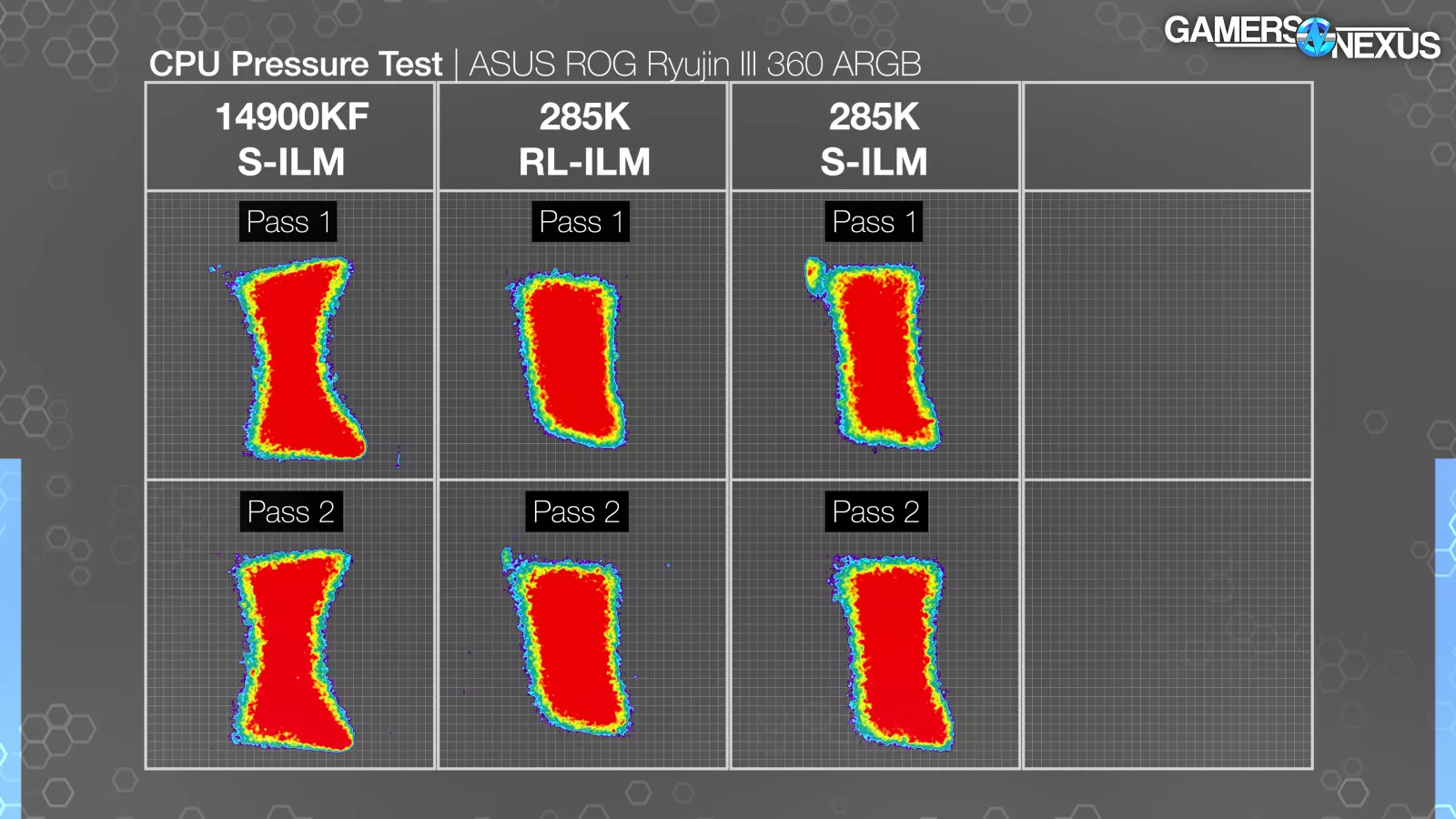 These images show a new pressure scan of our 14900KF with the ASUS Ryujin cooler and the old (or “standard”) ILM. In this scan, you can see the 14900KF has narrowing pressure on the left and right sides, with most of its pressure centered. That’s where it should be, and most of that is thanks to the comically protruding ASUS coldplate, but fuller coverage is ideal. The older IHS also is a little bit different shape than the new one. The second column represents the pre-installed reduced load ILM using the 285K. Looking at the third column, adding the standard ILM with the 285K, doesn’t look too different. The pressure profile appears to be distributed taller and narrower. There’s still some of that slimming effect going on when we get to the left and right sides but not nearly as pronounced as with the last gen IHS design and ILM.
