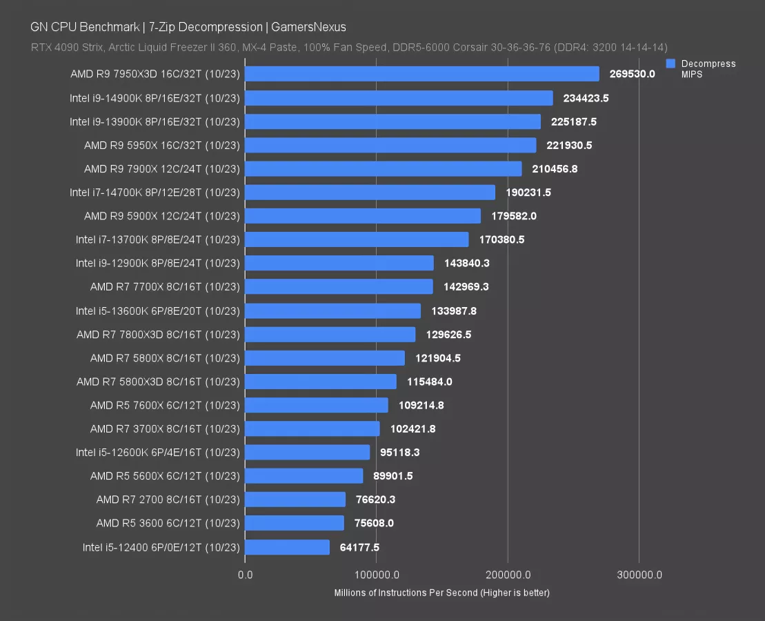 In decompression, it’s a little bit better at least -- the 14900K improves over the 13900K by 4% here. That has it behind the 7950X, not too distant from the 5950X, and leading the 14700K by 23%.