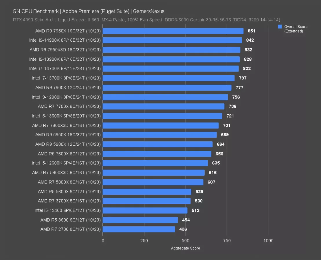 Adobe Premiere benchmarking via the Puget Suite is up now. This one has the 14900K at 842 points, leading the 13900K by 1.7%. So nearly margin of error, basically. Marvels like this are what Intel will be remembered for.