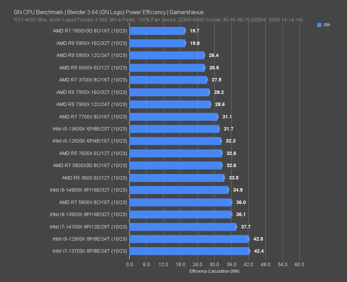 Energy efficiency testing will help us understand what all of this really means. For this number, we’re calculating the energy consumption during a Blender workload. Our metric is watt-hours, which allows us to see how much energy consumption there is for a CPU to complete the same workload. That means we’re normalizing for the workload, not the time. Lower is better.