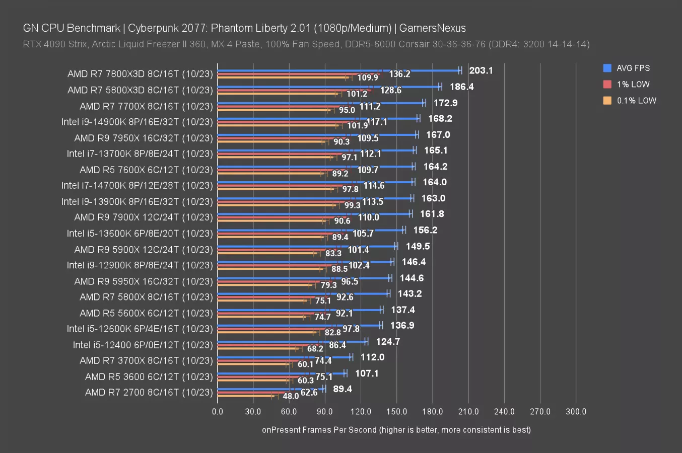 The 14900K’s 132FPS AVG has it 2.8% ahead of the 13900K, with the 14700K not meaningfully far behind. You’d never notice the difference between 126FPS and 132FPS, so selecting between them isn’t that important. The lead over the 7800X3D is at least more meaningful, at 15% improved.