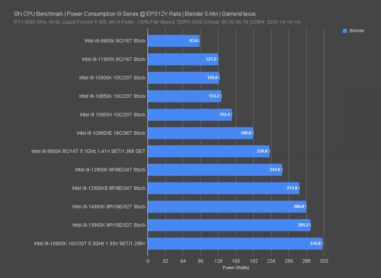 Here’s a look at more comparative power numbers: We measured the 14900K at 287W at the EPS12V cables -- meaning just the CPU and VRM efficiency losses -- when tested under an all-core Blender workload. That has it about the same as our 13900K, which was 295W previously. The 14700K’s 284W is about the same. AMD’s 7800X3D maxes-out at 86W all-core (although, to be fair, Intel won’t be at 100% CPU load in games like it is here -- but AMD is still advantaged). The 7950X CPU pulls 251W without Eco Mode, also below Intel’s 14900K.