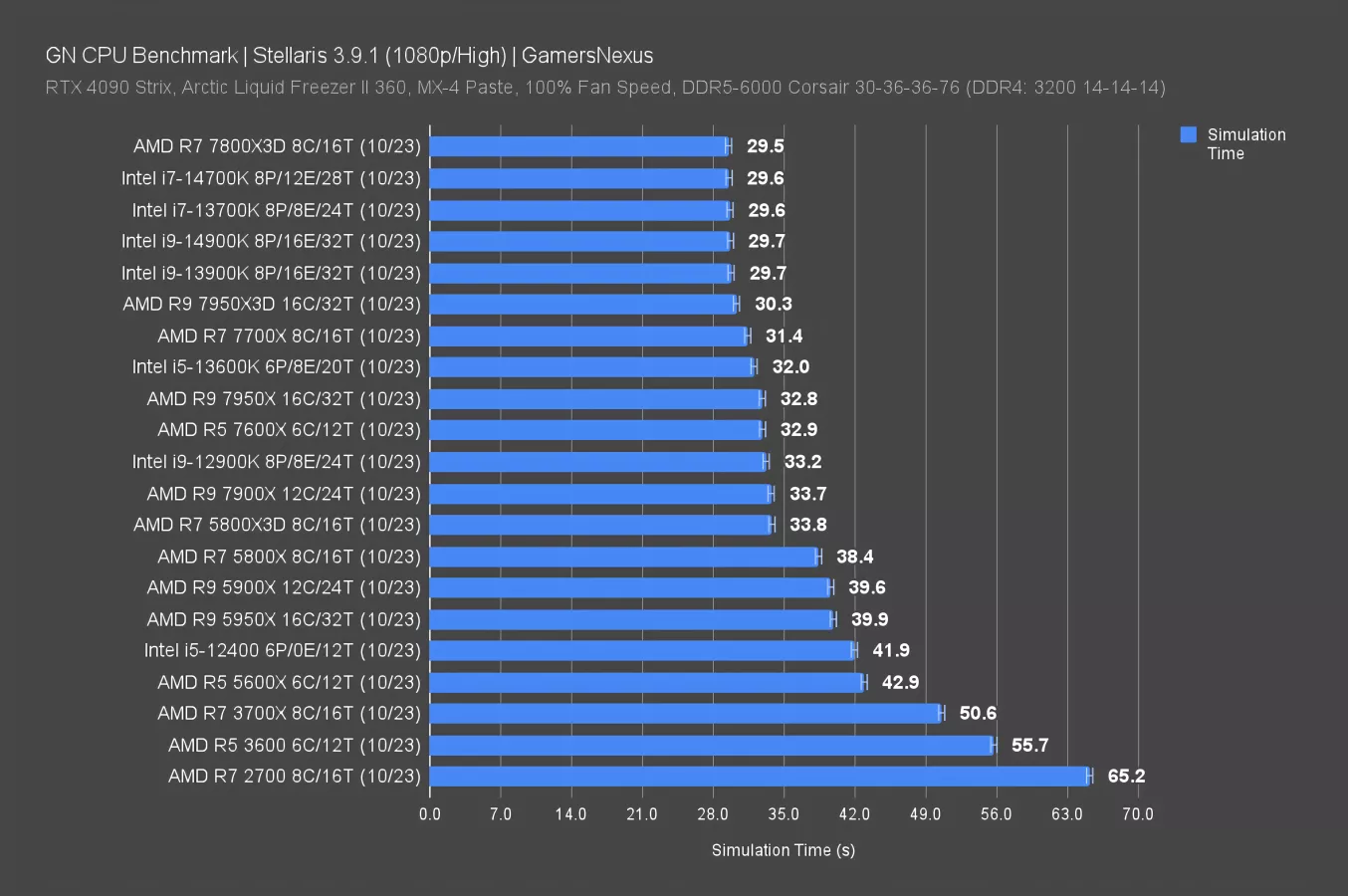 Stellaris is up now, measuring simulation time instead of FPS. We mentioned this in our 14700K review, but the game isn’t scaling much once we’re at around 30 seconds for simulation time. They’re all jumbling up to look the same due to other limitations. In our 14700K review, we asked those of you who are serious players to email your most complex, late game save file to our [email protected] inbox so we can see if we can find more scaling in the game for the next round.