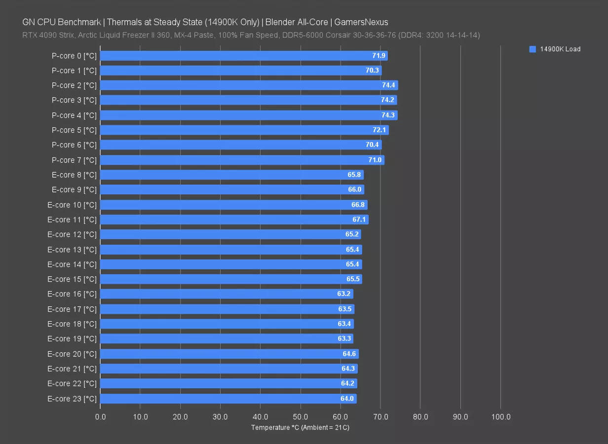 In our tests, we use Blender rendering for a realistic and heavy daily use case. We also test with a 360mm Arctic Liquid Freezer II (find the review here) at 100% fan and pump speeds (you can find our acoustic and other thermal data in our cooler reviews for that). Finally, other than controlling the board to not blast MCE or something, we basically let it do its thing with regard to voltages. That’s because we’re testing an out-of-the-box state (we'd control these voltages if doing a cooler test). This means that boards which are less controlled and push higher voltages, sometimes out of laziness to guarantee stability, will perform far worse than boards which are more tuned. We don’t try to pick one or the other - we just use whatever platform makes sense for the test or is sent by the company. In this case, the ASUS Z790 Dark Hero served as the test platform for the 14900K.