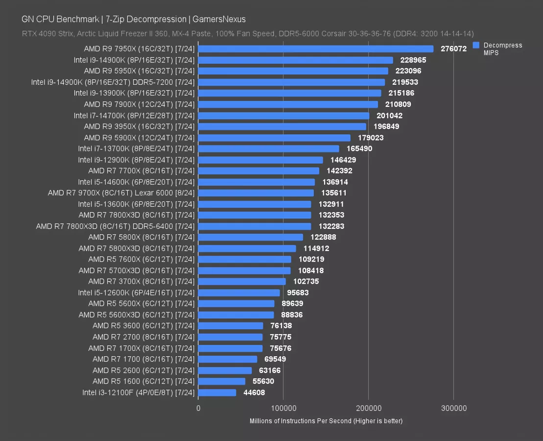 In decompression testing, the 9700X completed 136K MIPS, which roughly tied it with the 14600K (watch our review). Performance is below the 7700X for the reasons we discussed earlier. At best, you could maybe call them equal, but overall this is pretty disappointing.